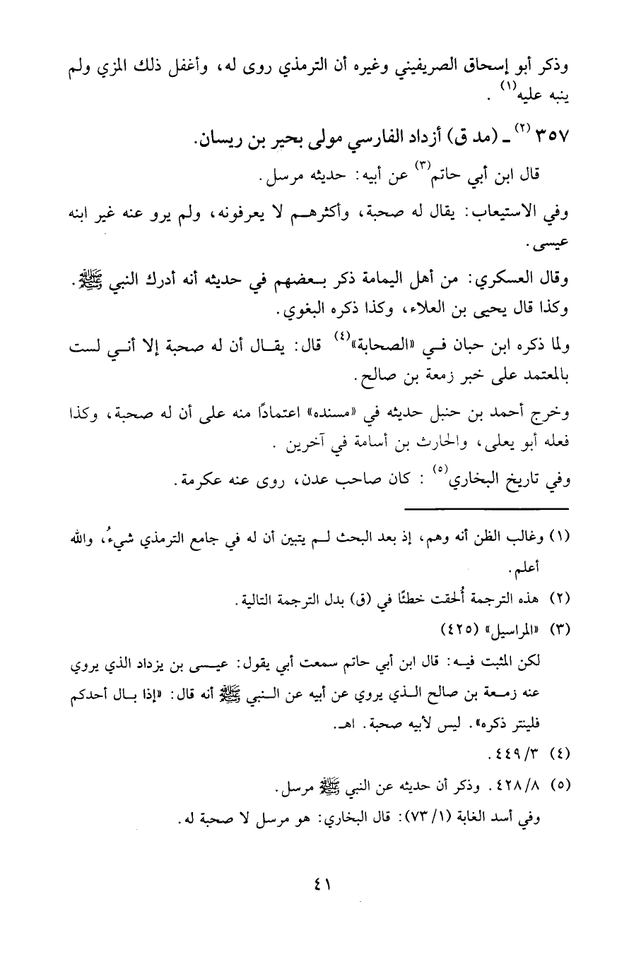 (3) (المراسيل) (425) لكن المثبت فيه: قال ابن أبي حاتم سمعت أبي يقول: عيسى بن يزداد الذي يروي عنه زمعة بن صالح الذي يروي عن أبيه عن النبي صَلى الله علَيهِ وسَلَّم أنه قال: (إذا بال أحدكم فلينتر ذكره). ليس لأبيه صحبة. اهـ.