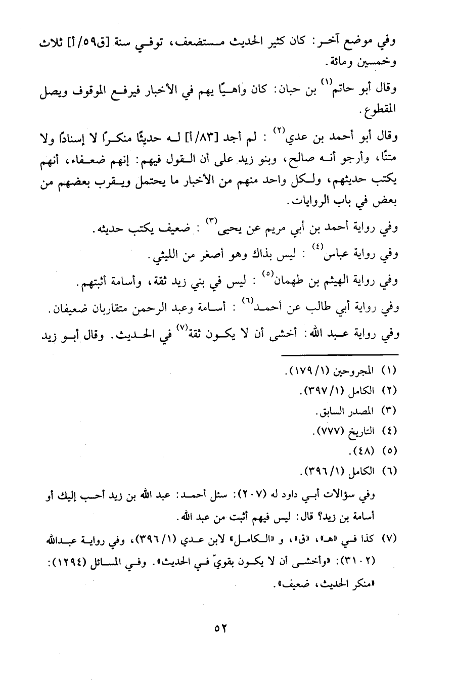 وفي رواية أبي طالب عن أحمد (6): أسامة وعبد الرحمن متقاربان ضعيفان.