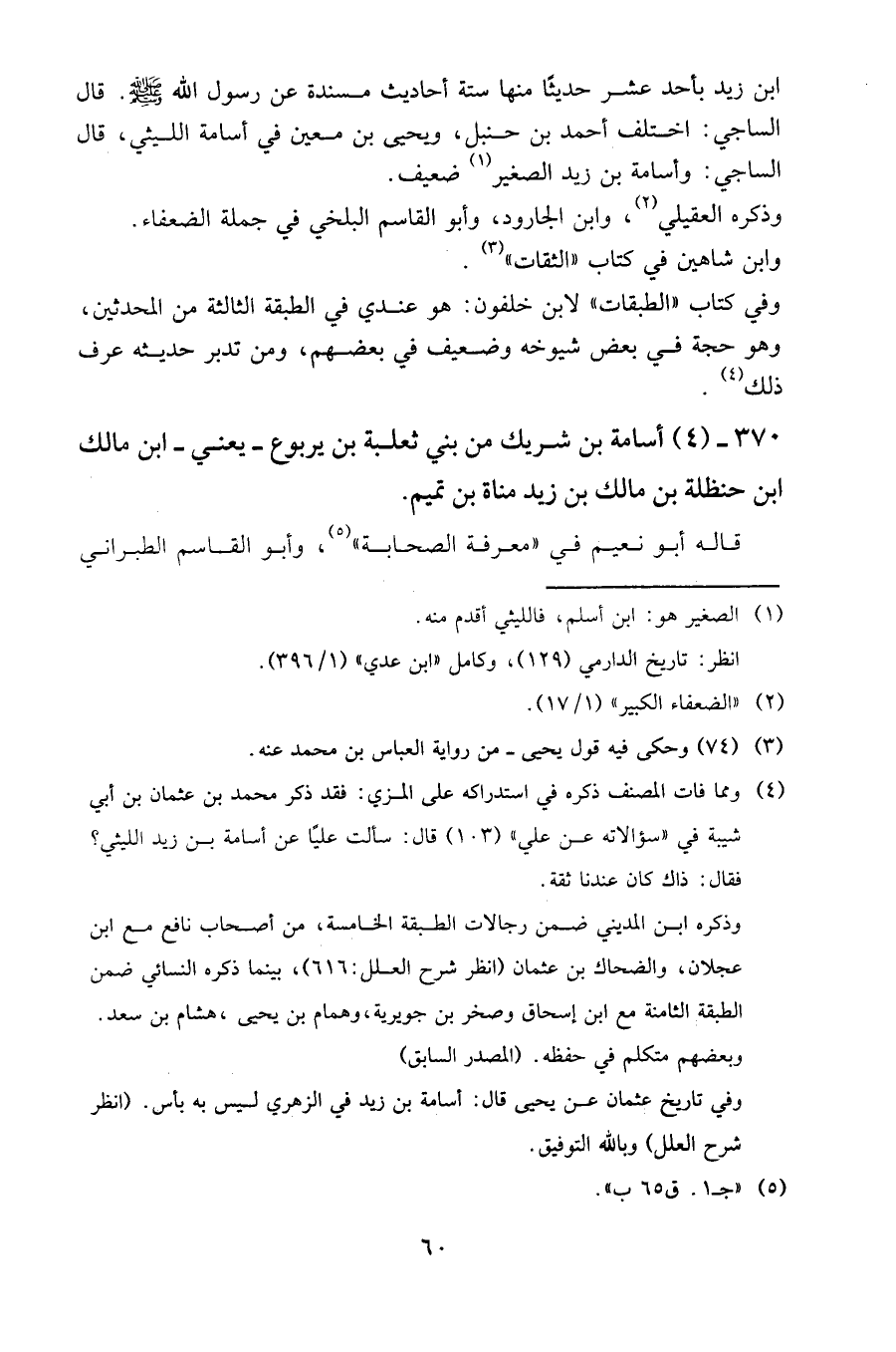 ابن زيد بأحد عشر حديثا منها ستة أحاديث مسندة عن رسول الله صَلى الله علَيهِ وسَلَّم. قال الساجي: اختلف أحمد بن حنبل، ويحيى بن معين في أسامة الليثي، قال الساجي: وأسامة بن زيد الصغير (1) ضعيف.