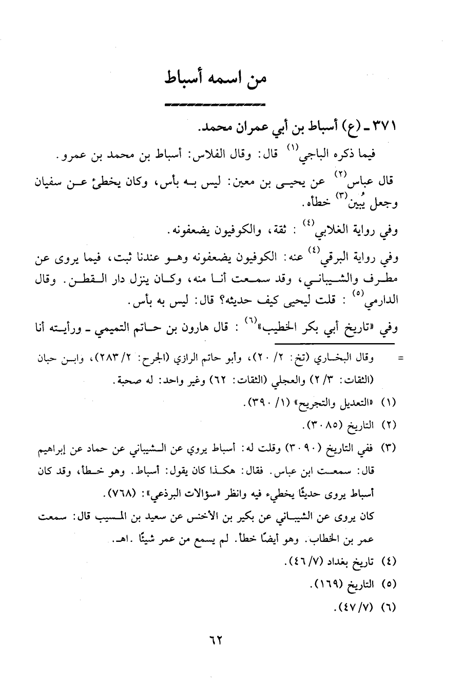 (3) ففي التاريخ (3090) وقلت له: أسباط يروي عن الشيباني عن حماد عن إبراهيم قال: سمعت ابن عباس. فقال: هكذا كان يقول: أسباط، وهو خطأ، وقد كان أسباط يروى حديثا يخطئ فيه وانظر (سؤالات البرذعي): (768).