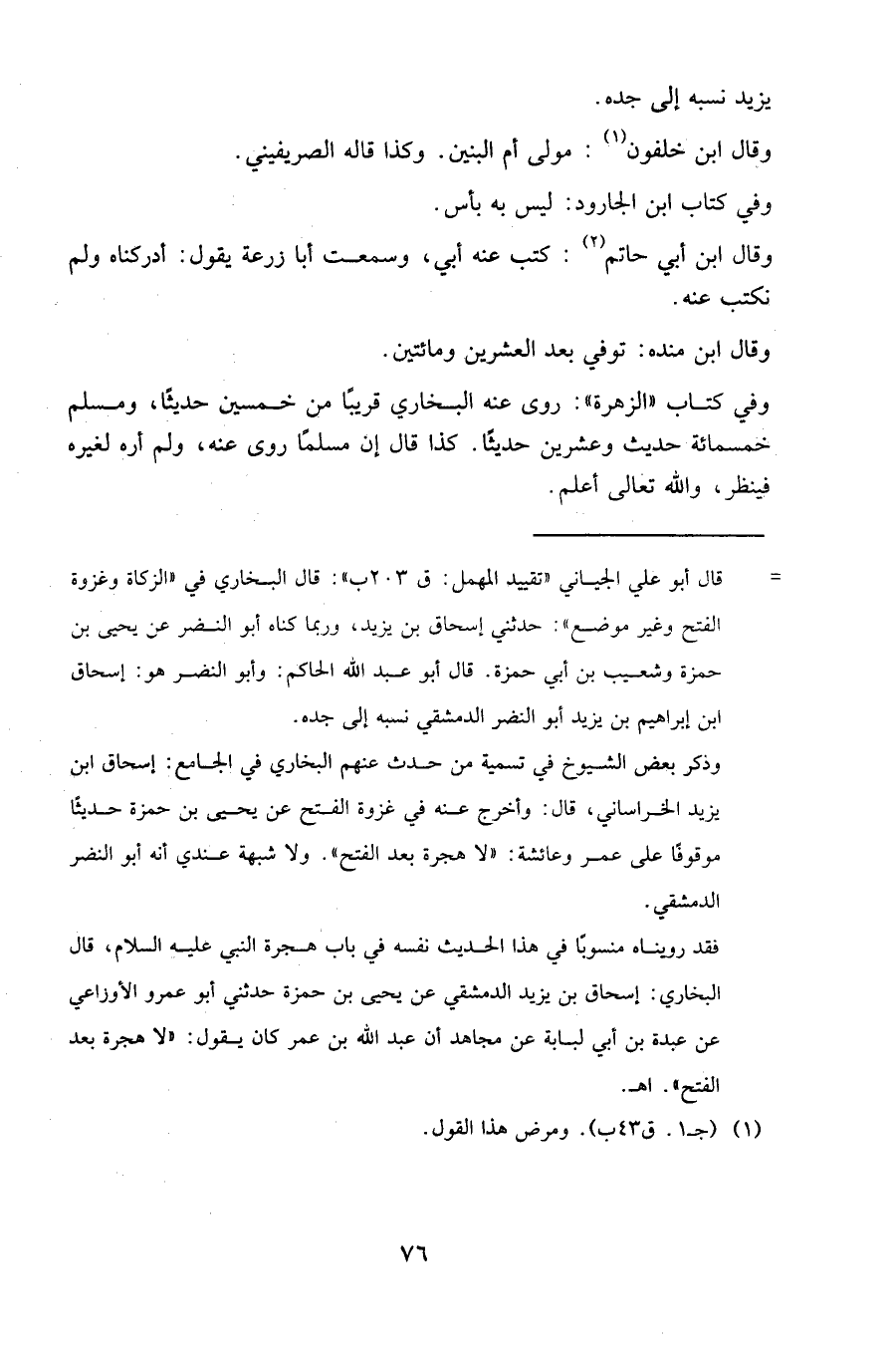 وذكر بعض الشيوخ في تسمية من حدث عنهم البخاري في الجامع: إسحاق ابن يزيد الخراساني، قال: وأخرج عنه في غزوة الفتح عن يحيى بن حمزة حديثا موقوفا على عمر وعائشة: (لا هجرة بعد الفتح)، ولا شبهة عندي أنه أبو النضر الدمشقي.