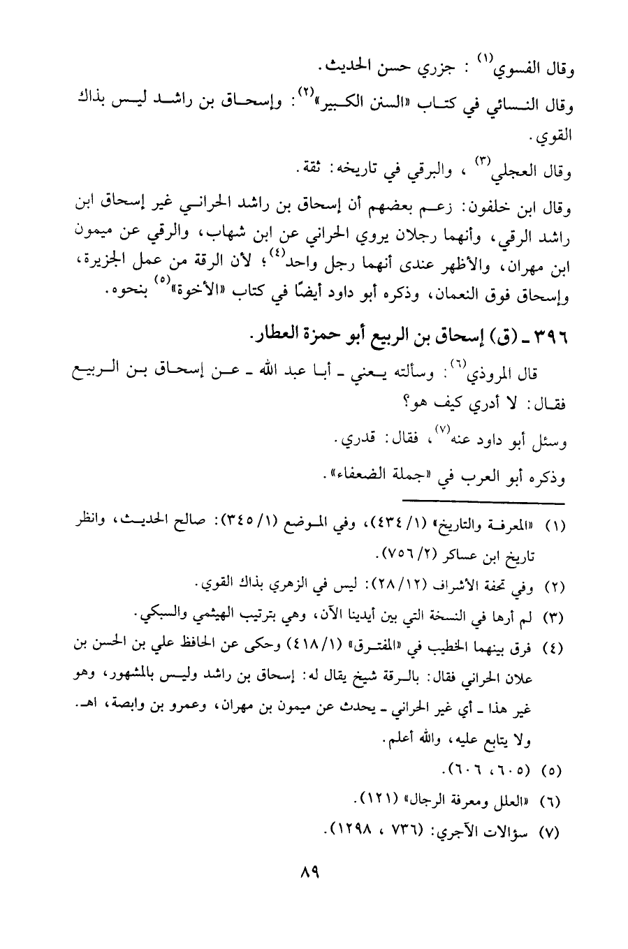 وقال ابن خلفون: زعم بعضهم أن إسحاق بن راشد الحراني غير إسحاق ابن راشد الرقي، وأنهما رجلان يروي الحراني عن ابن شهاب، والرقي عن ميمون بن مهران، والأظهر عندي أنهما رجل واحد (4)، لأن الرقة من عمل الجزيرة، وإسحاق فوق النعمان، وذكره أبو داود أيضا في كتاب (الأخوة) (5) بنحوه.