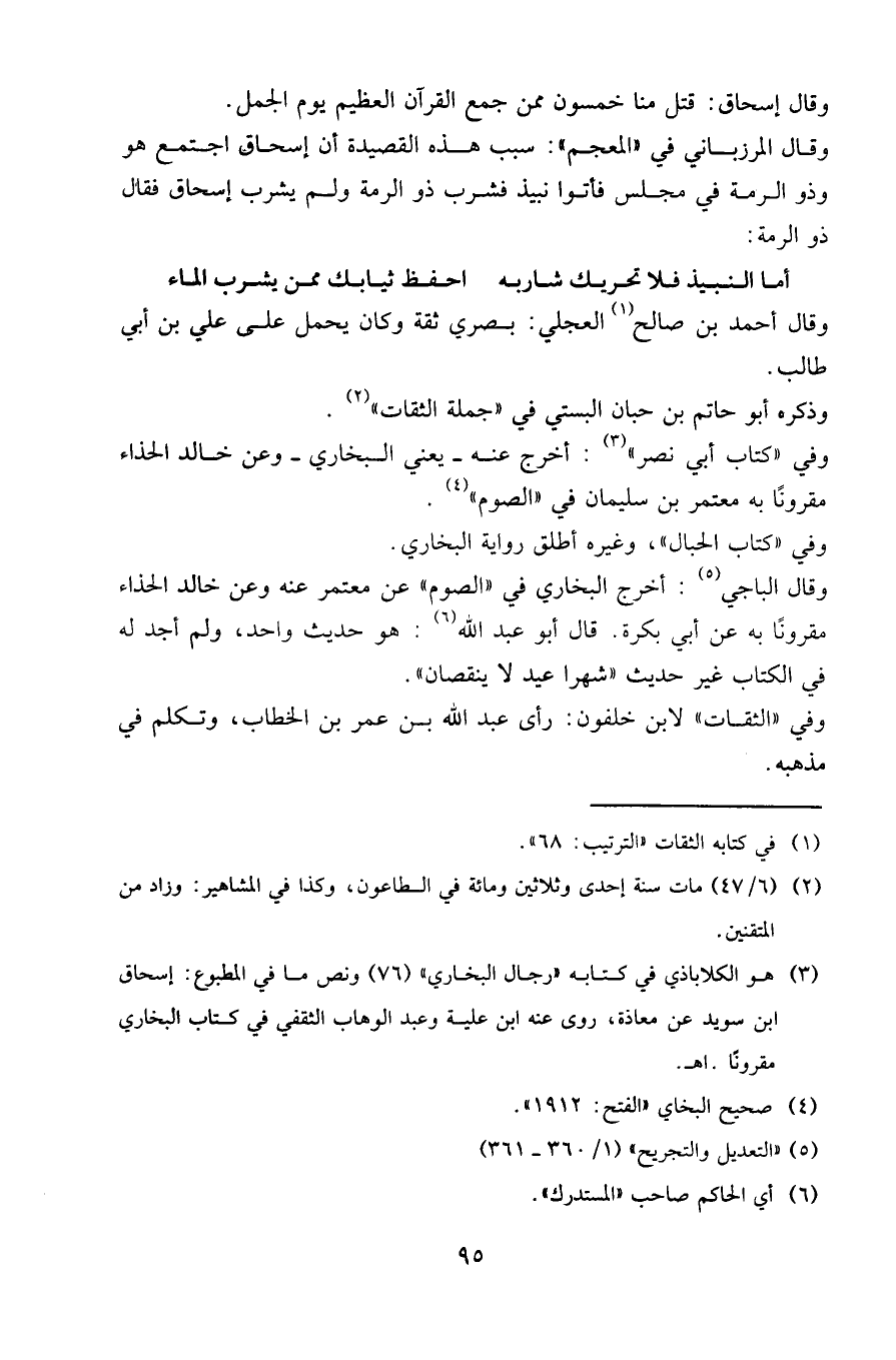 (3) هو الكلاباذي في كتابه (رجال البخاري) (76) ونص ما في المطبوع: إسحاق ابن سويد عن معاذة، روى عنه ابن علية وعبد الوهاب الثقفي في كتاب البخاري مقرونا. اهـ.