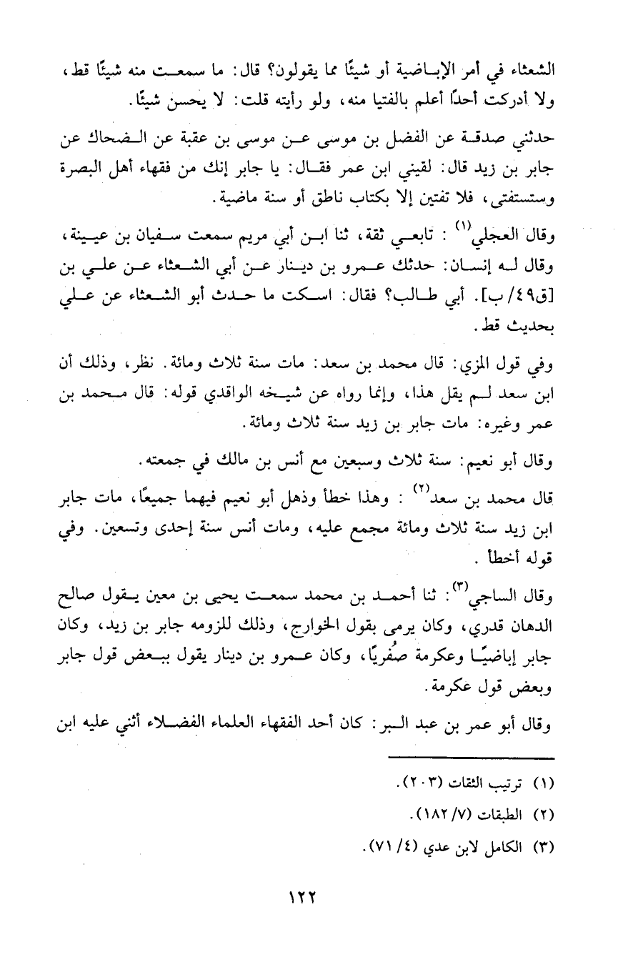الشعثاء في أمر الإباضية أو شيئا مما يقولون؟ قال: ما سمعت منه شيئا قط، ولا أدركت أحدا أعلم بالفتيا منه، ولو رأيته قلت: لا يحسن شيئا.