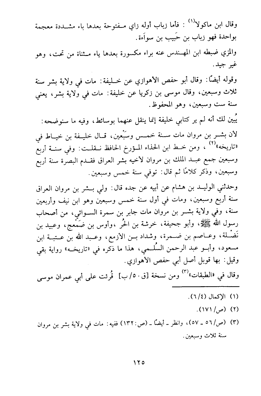 وقوله أيضا: وقال أبو حفص الأهوازي عن خليفة: مات في ولاية بشر سنة ثلاث وسبعين، وقال موسى بن زكريا عن خليفة: مات في ولاية بشر، يعني سنة ست وسبعين، وهو المحفوظ.