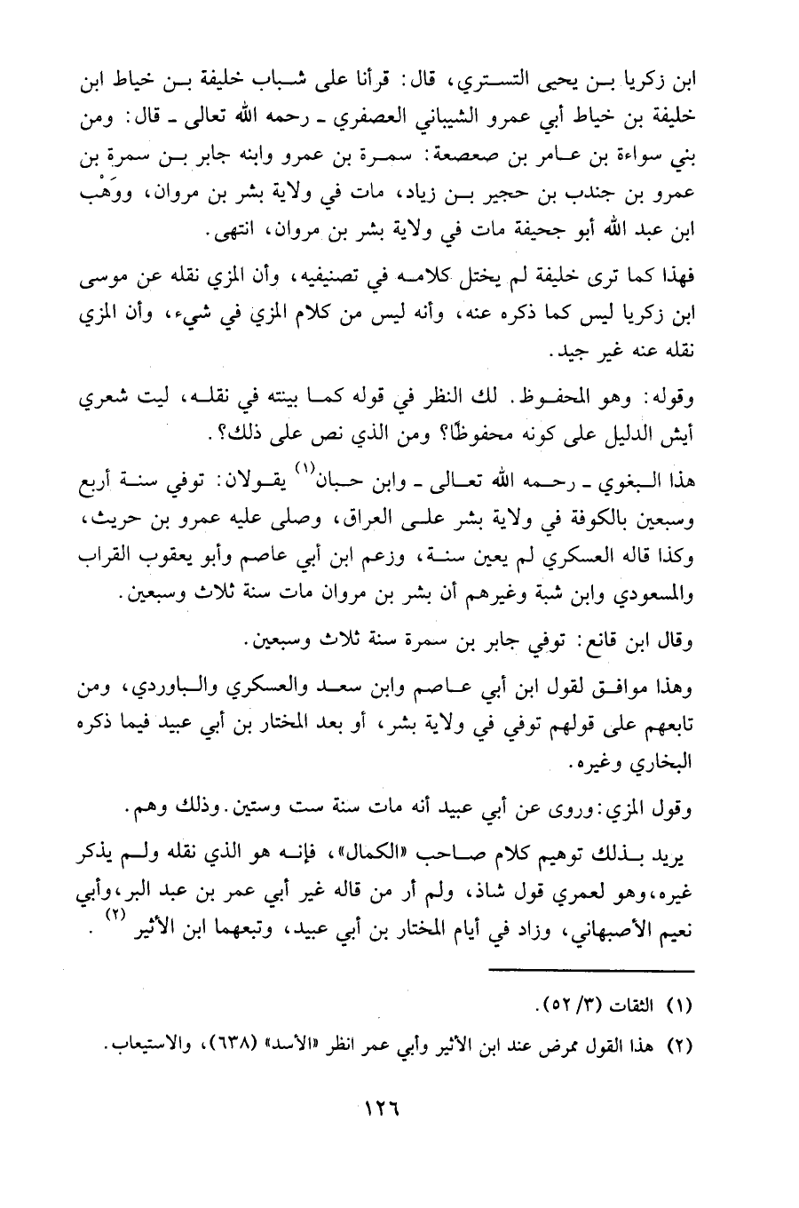 ابن زكريا بن يحيى التستري، قال: قرأنا على شباب خليفة بن خياط بن خليفة بن خياط أبي عَمرو الشيباني العصفري - رحمه الله تعالى - قال: ومن بني سواءة بن عامر بن صعصعة: سمرة بن عَمرو وابنه جابر بن سمرة بن عَمرو بن جندب بن حجير بن زياد، مات في ولاية بشر بن مروان، ووهب بن عبد الله أبو جحيفة مات في ولاية بشر بن مروان، انتهى.