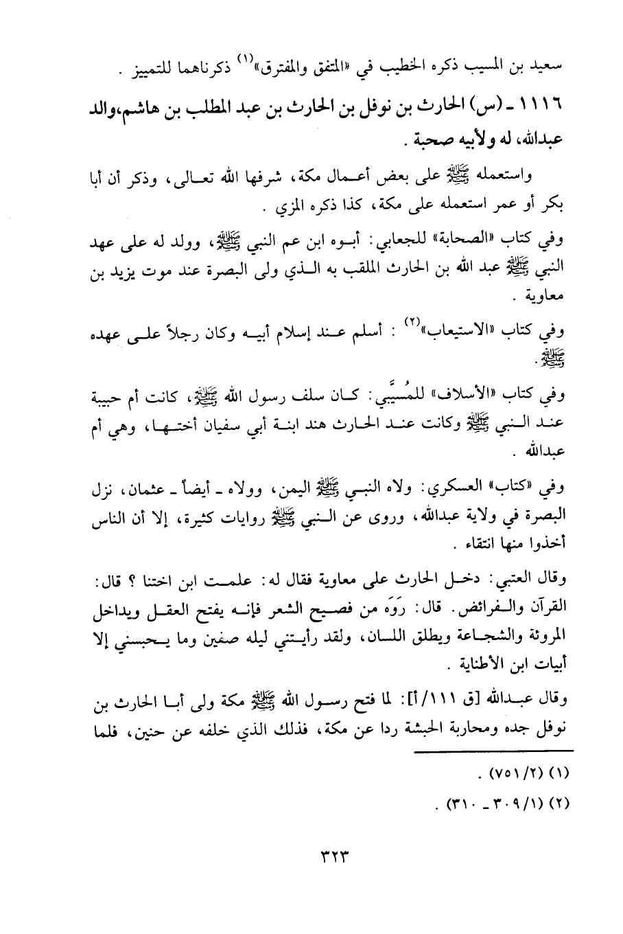 1116- (س) الحارث بن نوفل بن الحارث بن عبد المطلب بن هاشم، والد عبد الله، له ولأبيه صحبة.