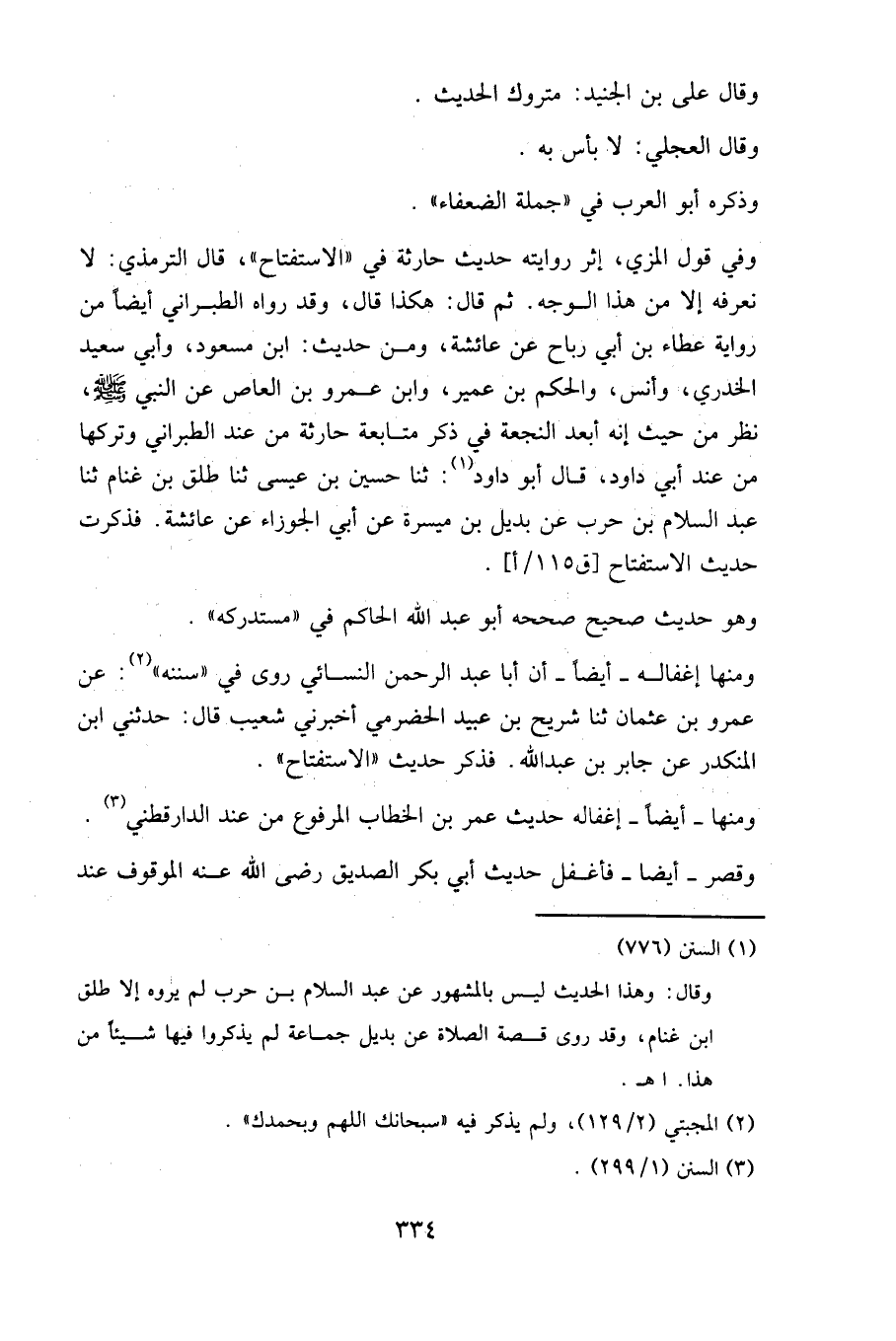 وفي قول المزي، إثر روايته حديث حارثة في "الاستفتاح"، قال الترمذي: لا نعرفه إلا من هذا الوجه. ثم قال: هكذا قال، وقد رواه الطبراني أيضا من رواية عطاء بن أبي رباح عن عائشة، ومن حديث: ابن مسعود، وأبي سعيد الخدري، وأنس، والحكم بن عمير، وابن عَمرو بن العاص عن النبي صلى الله عليه وسلم، نظر من حيث أنه أبعد النجعة في ذكر متابعة حارثة من عند الطبراني وتركها من عند أبي داود، قال أبو داود: حَدَّثنا حسين بن عيسى حَدَّثنا طلق بن غنام حَدَّثنا عبد السلام بن حرب عن بديل بن ميسرة عن أبي الجوزاء عن عائشة. فذكرت حديث الاستفتاح [ق 115/أ].