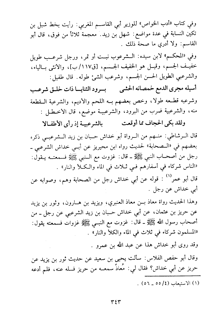 قال الرشاطي: منهم من الرواة أبو خداش حِبان بن زيد الشرعبي، ذكره بعضهم في "الصحابة" لحديث رواه ابن محيريز عن أبي خداش الشرعبي - رجل من أصحاب النبي صلى الله عليه وسلم - قال: غزوت مع النبي صلى الله عليه وسلم فسمعته يقول: "الناس شركاء في أسفارهم في ثلاث في الماء والكلأ والنار".