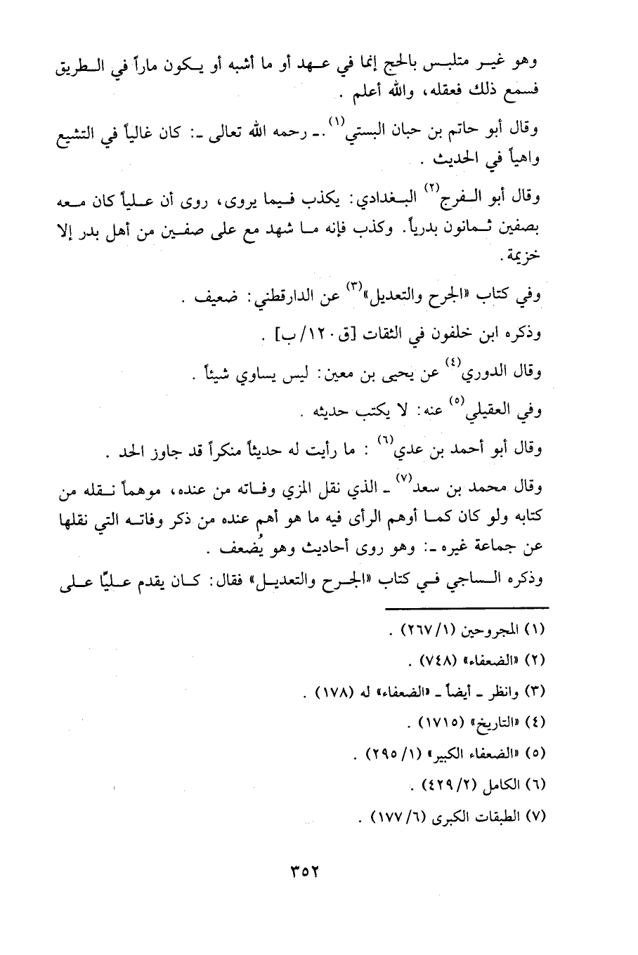 وقال أبو الفرج البغدادي: يكذب فيما يروي، روى أن عليا كان معه بصفين ثمانون بدريا، وكذب؛ فإنه ما شهد مع علي صفين من أهل بدر إلا خزيمة.