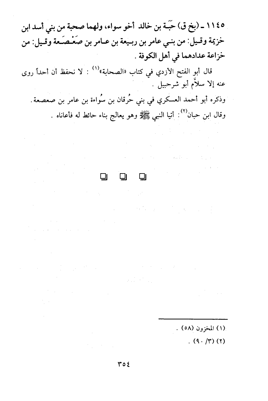 1145- (بخ ق) حبة بن خالد أخو سواء، ولهما صحبة، من بني أسد ابن خزيمة، وقيل: من بني عامر بن ربيعة بن عامر بن صعصعة، وقيل: من خزاعة، عدادهما في أهل الكوفة.