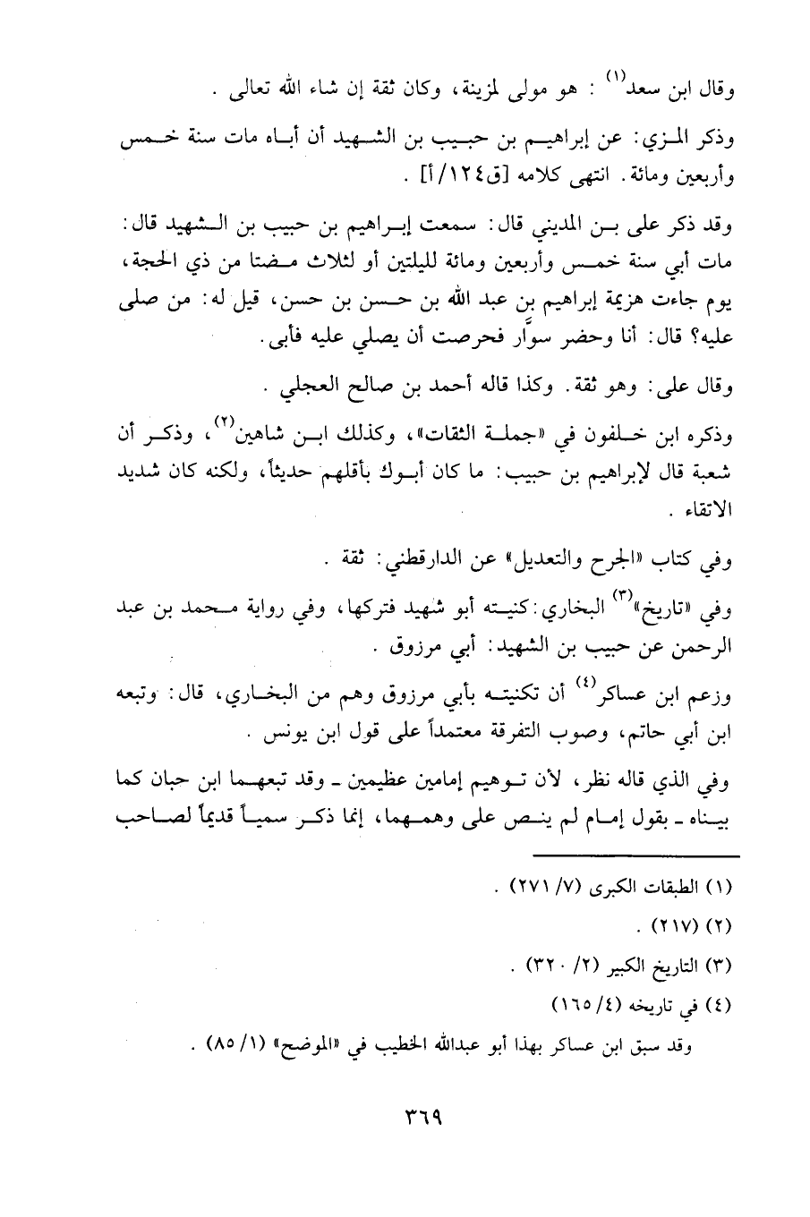 وذكر المزي: عن إبراهيم بن حبيب بن الشهيد أن أباه مات سنة خمس وأربعين ومِائَة. انتهى كلامه [ق 124/أ].