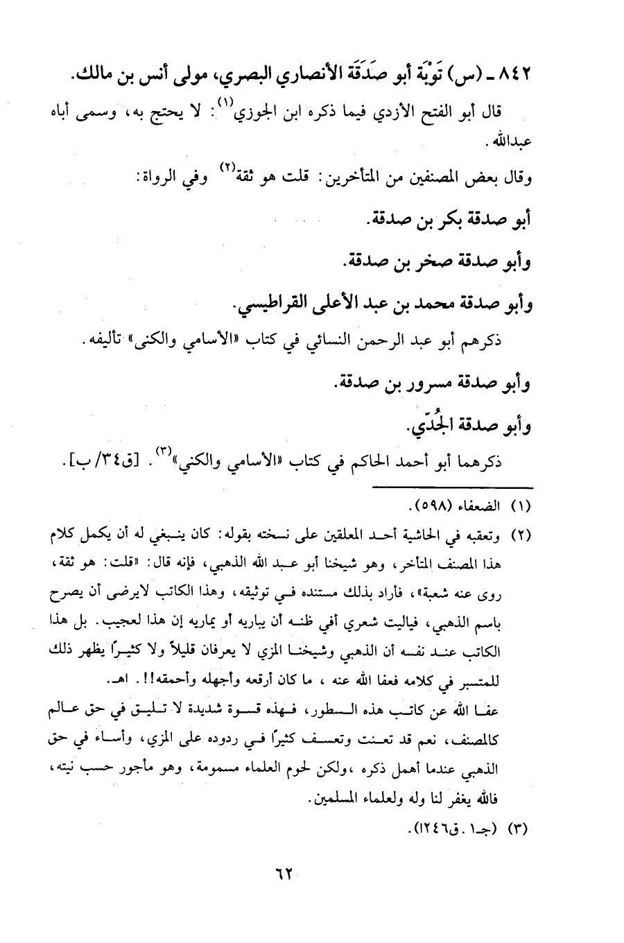 842 - (س) توبة أبو صدقة الأنصاري البصري، مولى أنس بن مالك.