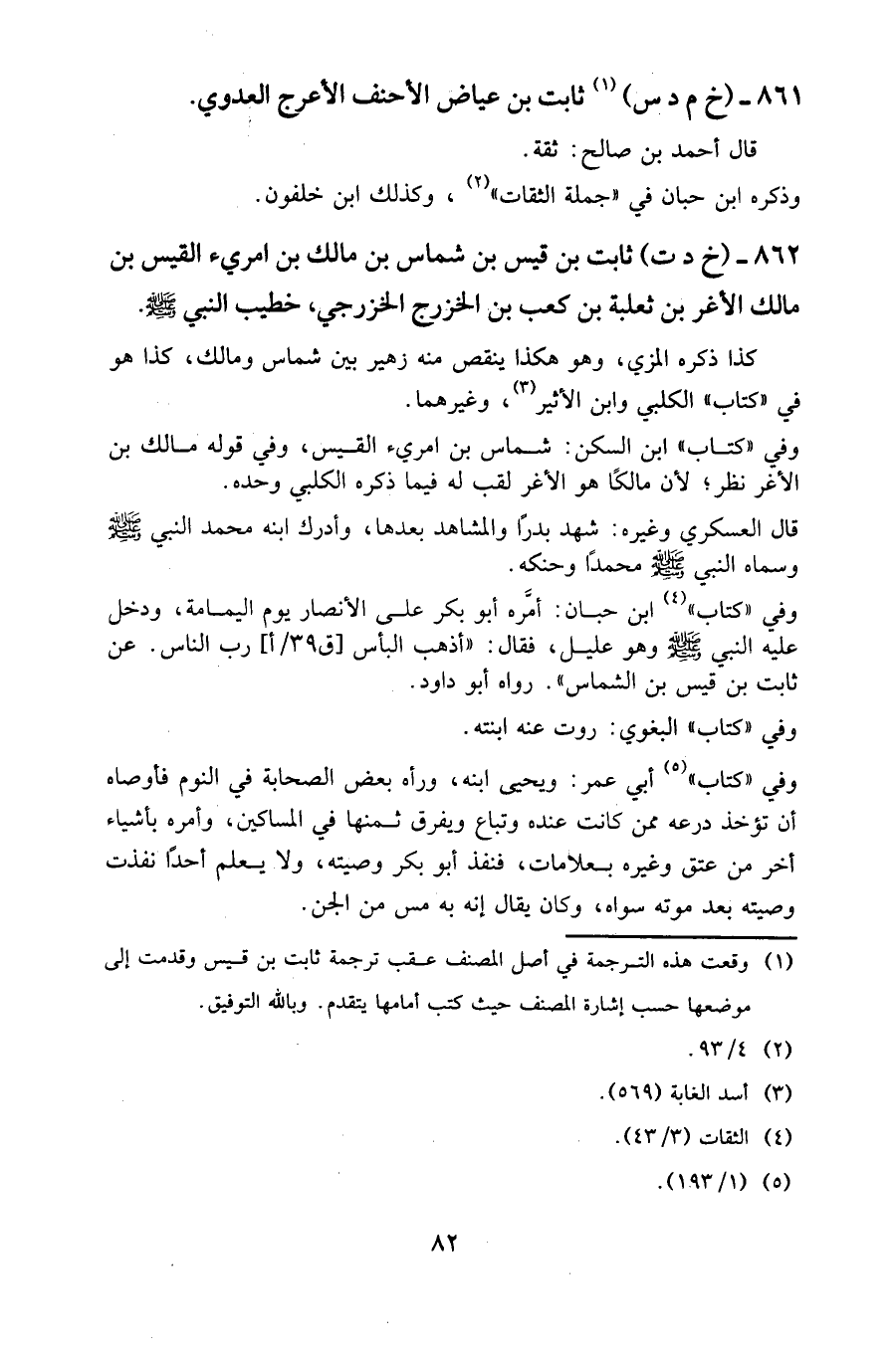 862 - (خ د ت) ثابت بن قيس بن شماس بن مالك بن امرئ القيس بن مالك الأغر بن ثعلبة بن كعب بن الخزرج الخزرجي، خطيب النبي صلى الله عليه وسلم.