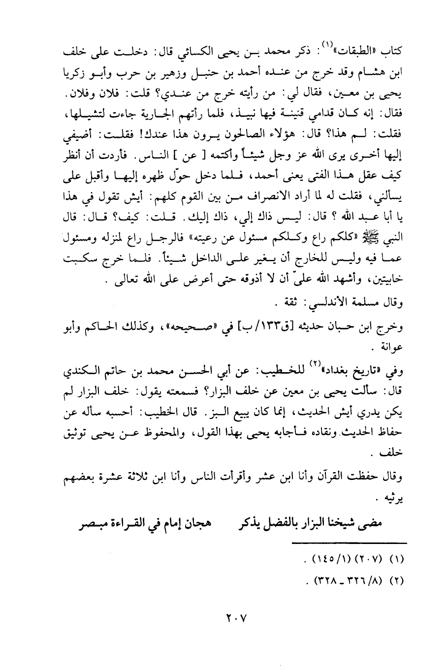 وفي "تاريخ بغداد" للخطيب: عن أبي الحسن محمد بن حاتم الكندي قال: سألت يحيى بن معين عن خلف البزار؟ فسمعته يقول: خلف البزار لم يكن يدري أيش الحديث، إنما كان يبيع البز. قال الخطيب: أحسبه سأله عن حفاظ الحديث ونقاده، فأجابه يحيى بهذا القول، والمحفوظ عن يحيى توثيق خلف.