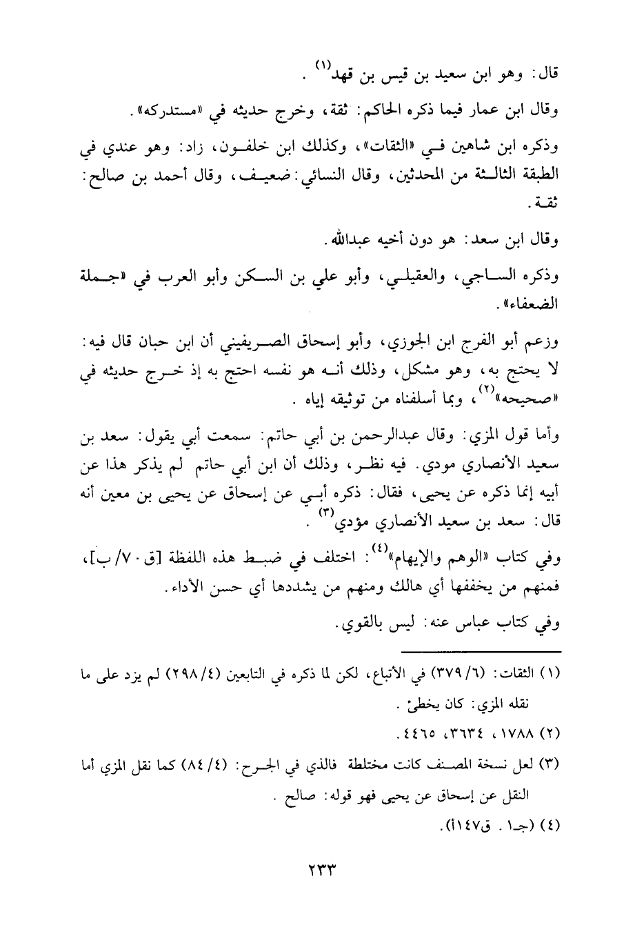 وأما قول المزي: وقال عبد الرحمن بن أبي حاتم: سمعت أبي يقول: سعد بن سعيد الأنصاري مودي. فيه نظر، وذلك أن ابن أبي حاتم لم يذكر هذا عن أبيه إنما ذكره عن يحيى، فقال: ذكره أبي عن إسحاق عن يحيى بن معين أنه قال: سعد بن سعيد الأنصاري مؤدي.