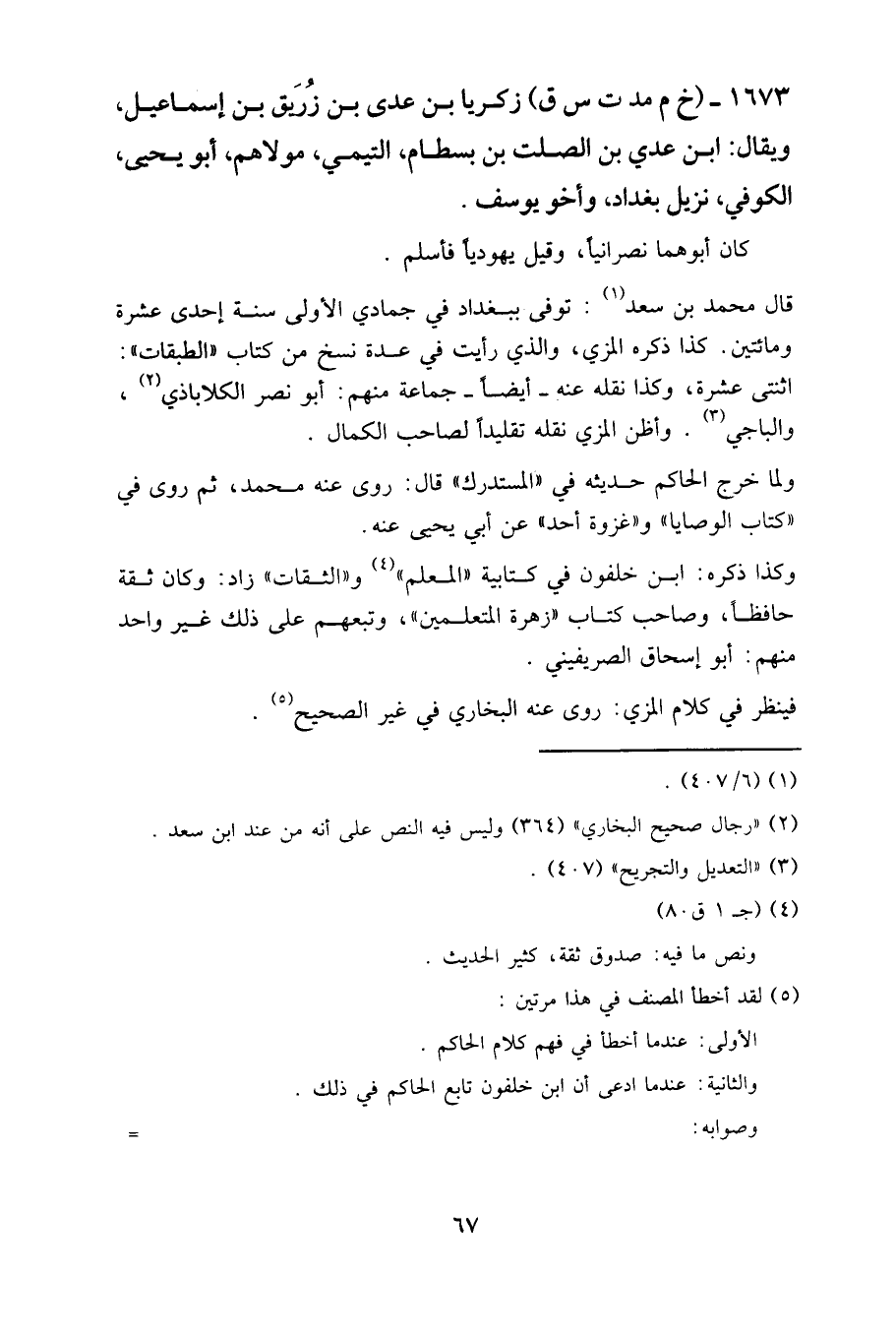 1673 - (خ م مد ت س ق) زكريا بن عدي بن زريق بن إسماعيل، ويقال: ابن عدي بن الصلت بن بسطام، التيمي، مولاهم، أبو يحيى، الكوفي، نزيل بغداد، وأخو يوسف.