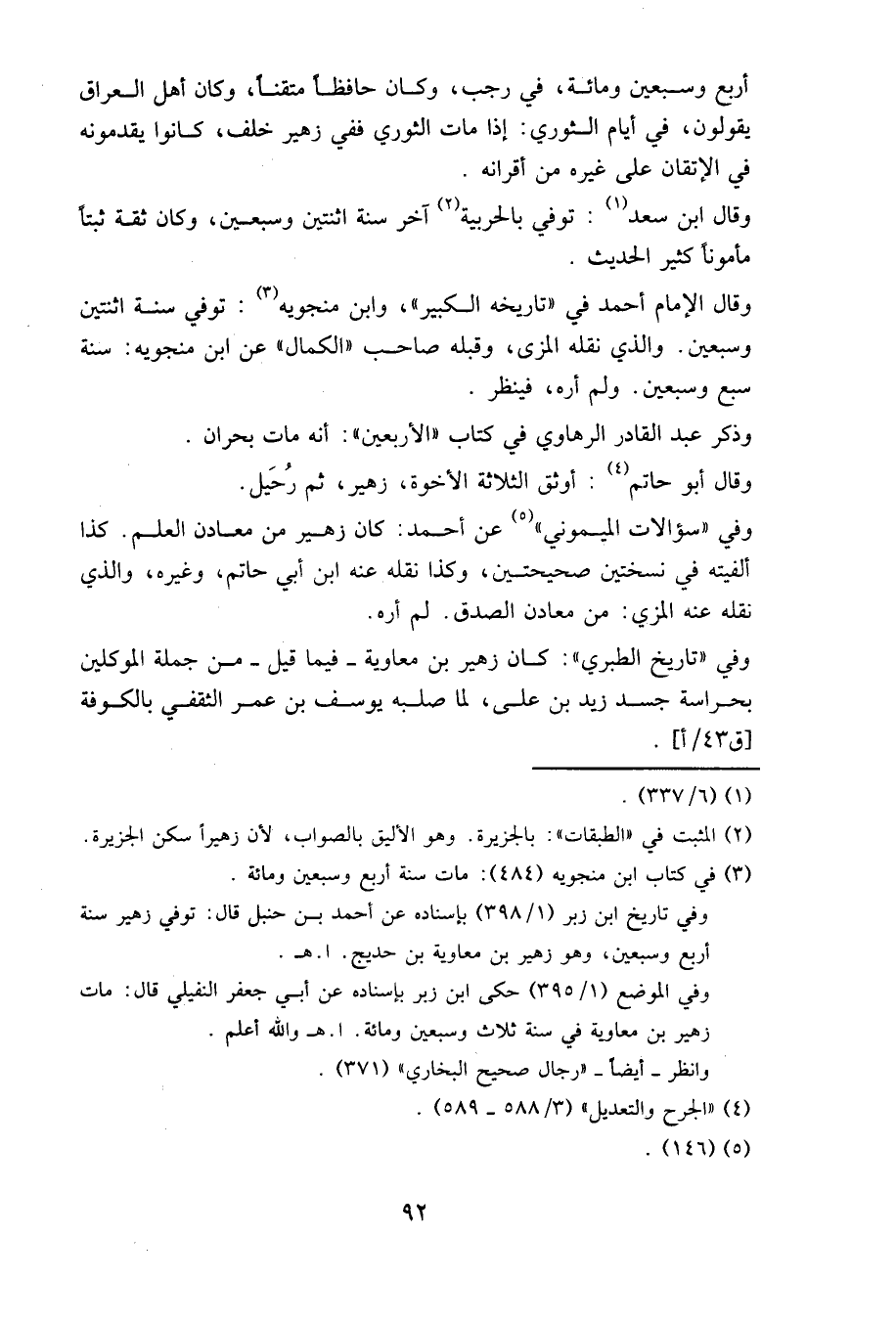 وفي "تاريخ الطبري": كان زهير بن معاوية فيما قيل من جملة الموكلين بحراسة جسد زيد بن علي، لما صلبه يوسف بن عمر الثقفي بالكوفة [ق 43/أ].