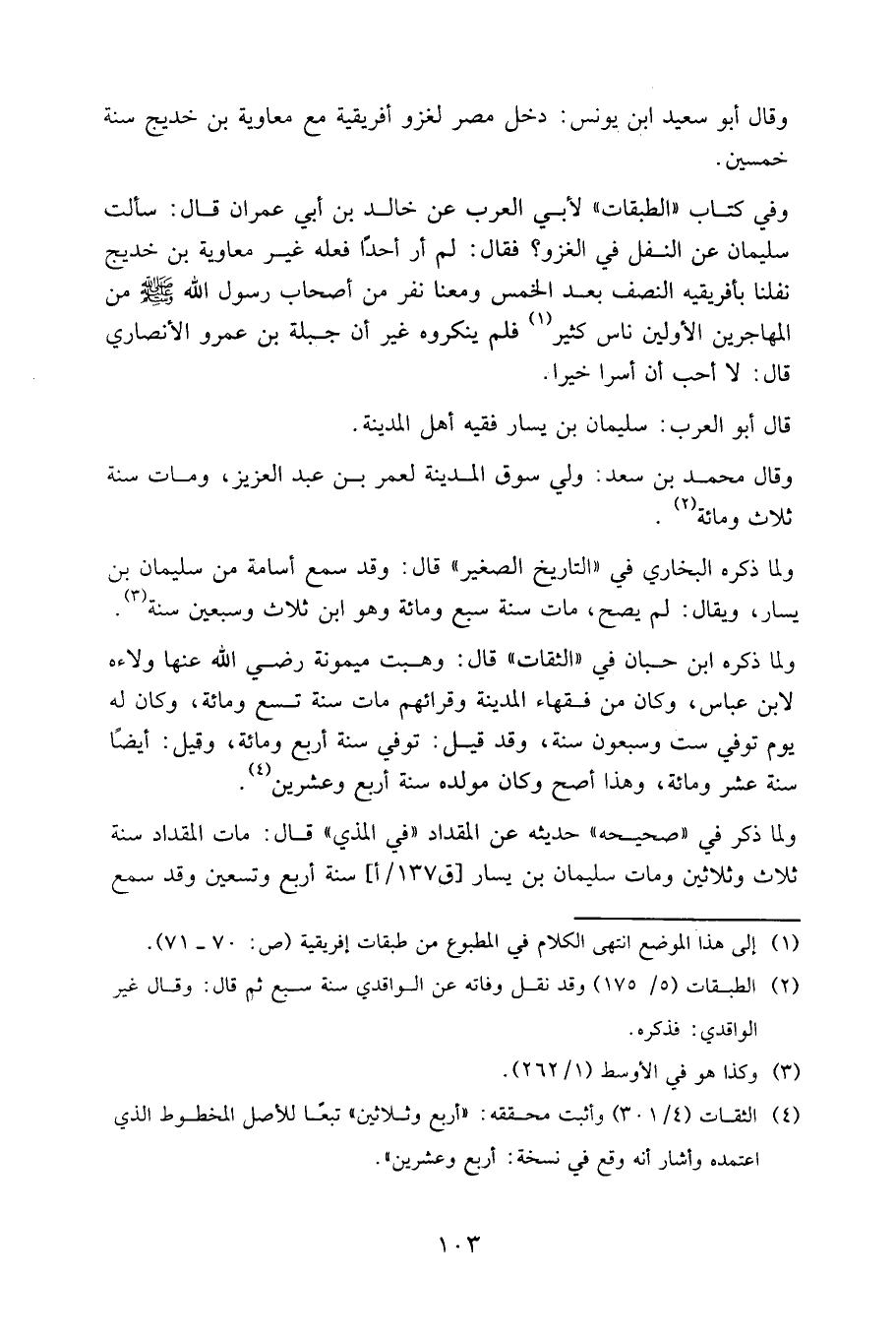 ولما ذكره البخاري في "التاريخ الصغير" قال: وقد سمع أسامة من سليمان بن يسار، ويقال: لم يصح، مات سنة سبع ومِائَة وهو ابن ثلاث وسبعين سنة.