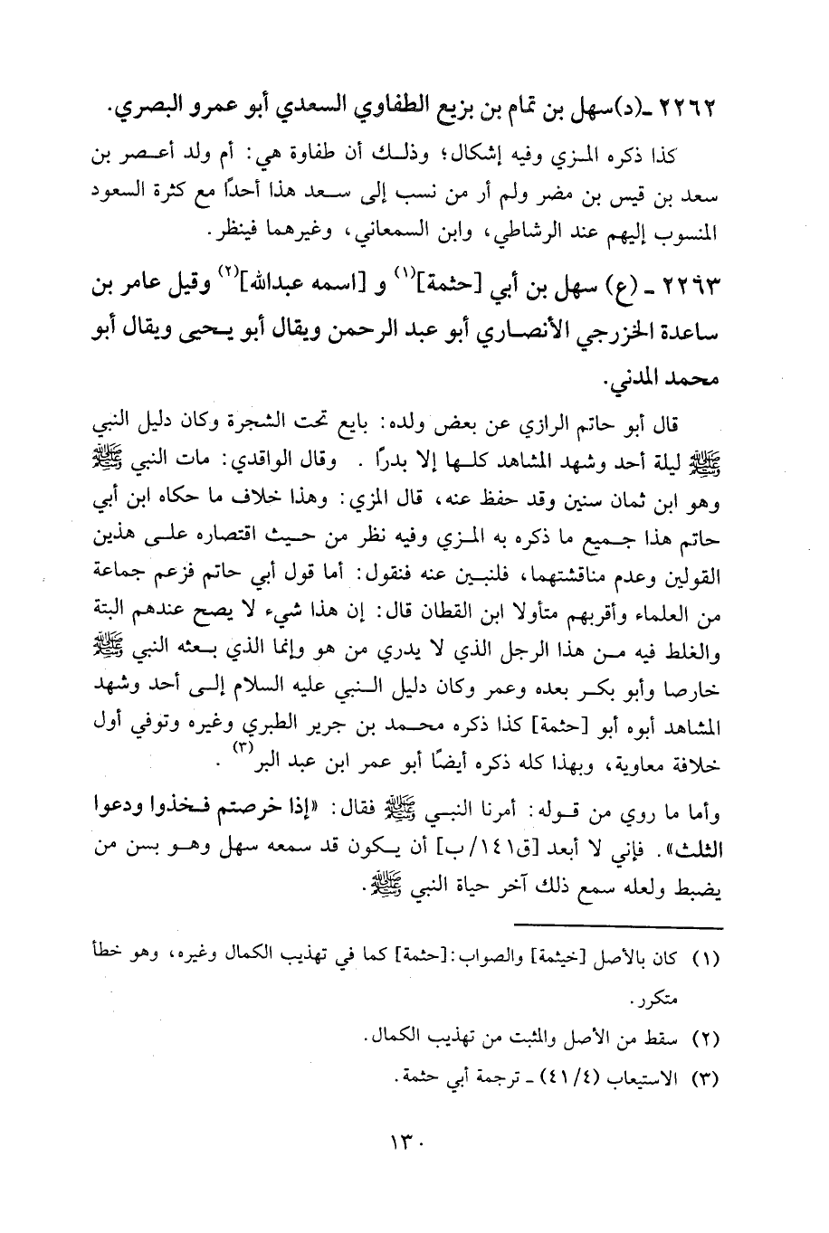 2263 - (ع) سهل بن أبي (حثمة) و (اسمه عبد الله) وقيل عامر بن ساعدة الخزرجي الأنصاري أبو عبد الرحمن ويقال أبو يحيى ويقال أبو محمد المدني.