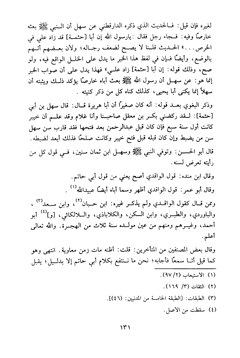 لغيره فإن قيل: فالحديث الذي ذكره الدارقطني عن سهل أن النبي صلى الله عليه وسلم بعثه خارصا وفيه: فجاء رجل فقال: يا رسول الله إن أبا (حثمة) قد زاد علي في الخرص..." الحديث قلنا لا يصح لضعف رجاله؛ ولأن بعضهم اتهم بالوضع، وأيضا فإن في لفظ هذا الخبر ما يدل على الخلل الواقع فيه، ولو صح، وذلك قوله: إن أبا (حثمة) زاد علي" فهذا يدل على أن صواب الخبر إنما هو: عن سهل أن رسول الله صلى الله عليه وسلم بعث أباه خارصا يؤكد ذلك ويثبته أن سهلا إنما يكنى أبا يحيى، كذلك كناه كل من ذكر كنيته.