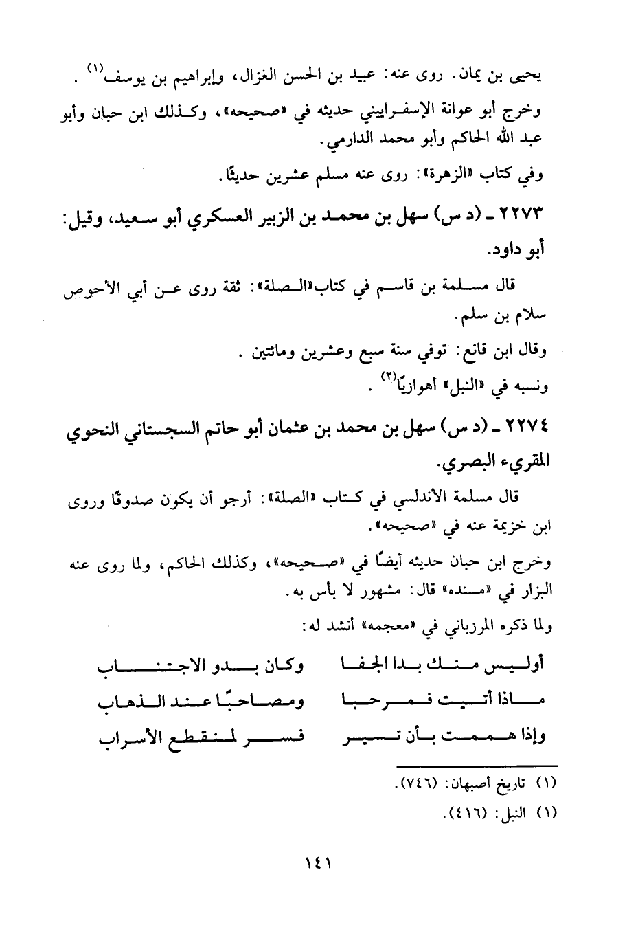 2274- (د س) سهل بن محمد بن عثمان أبو حاتم السجستاني النحوي المقرئ البصري.