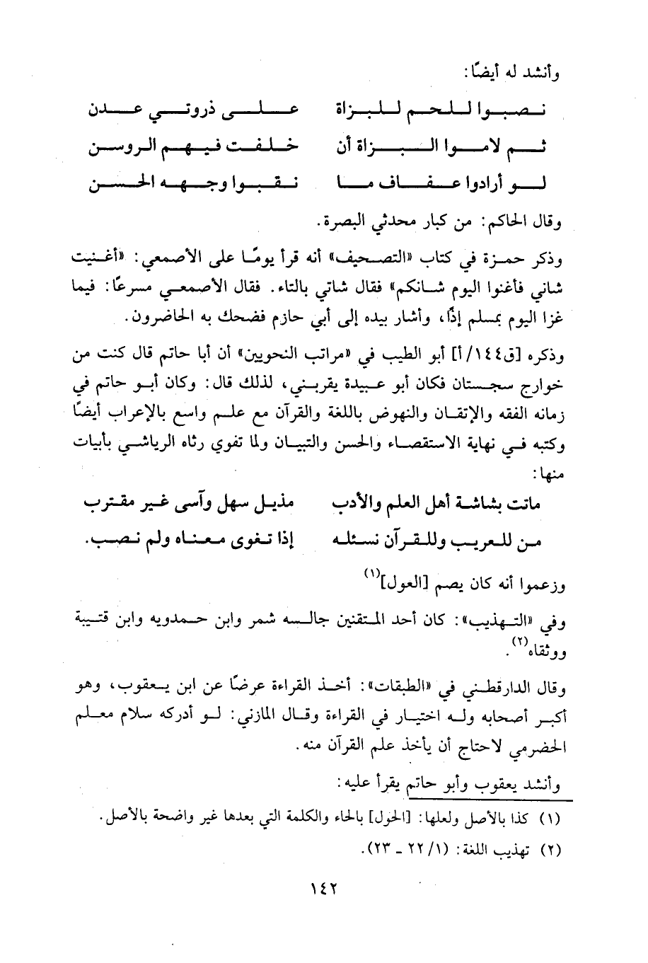 وذكره أبو الطيب في "مراتب النحويين" أن أبا حاتم قال كنت من خوارج سجستان فكان أبو عبيدة يقربني، لذلك قال: وكان أبو حاتم في زمانه الفقه والإتقان والنهوض باللغة والقرآن مع علم واسع بالإعراب أيضا، وكتبه في نهاية الاستقصاء والحسن والتبيان، ولما توفي رثاه الرياشي بأبيات منها: