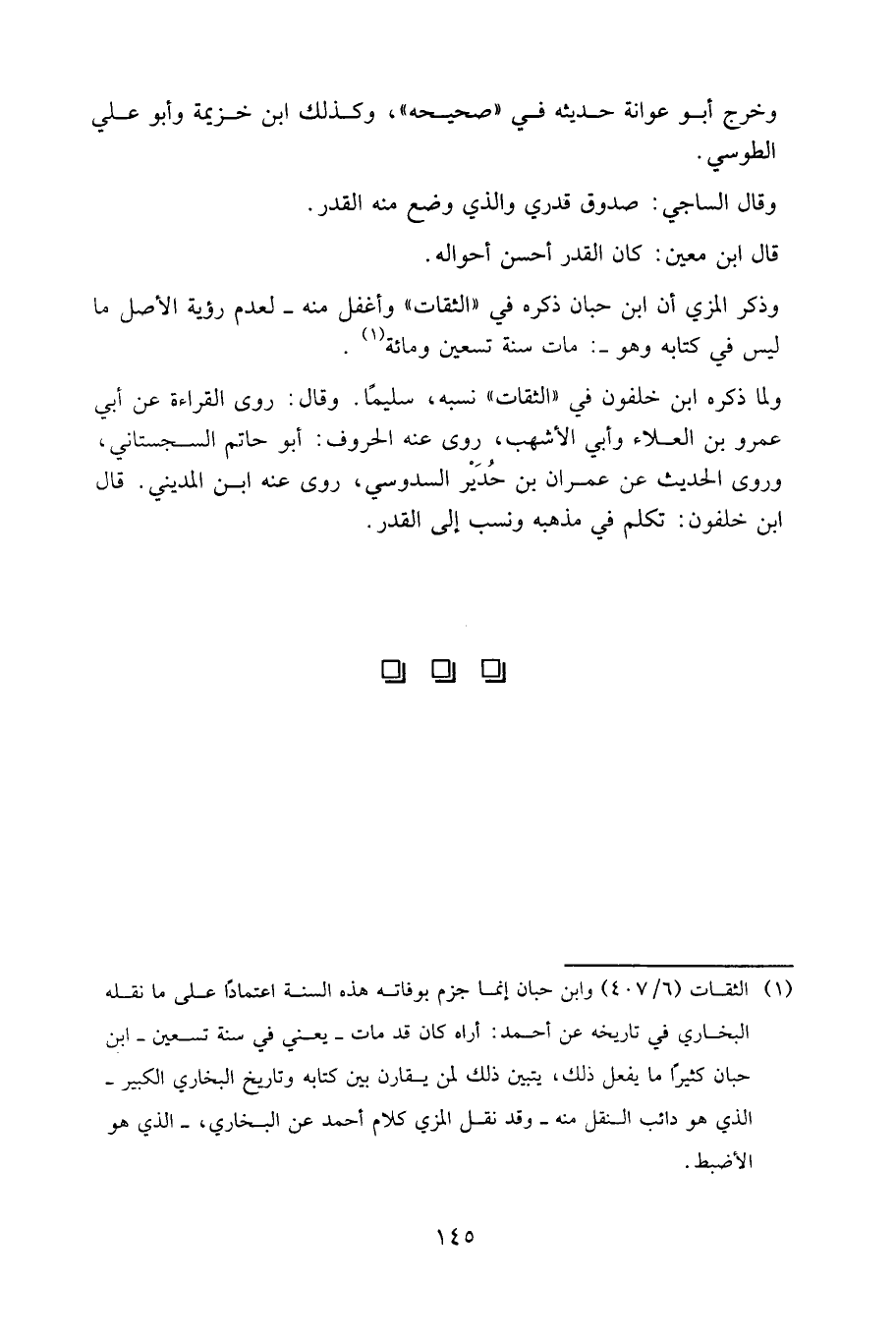 وذكر المزي أن ابن حبان ذكره في "الثقات" وأغفل منه لعدم رؤية الأصل ما ليس في كتابه وهو مات سنة تسعين ومِائَة.
