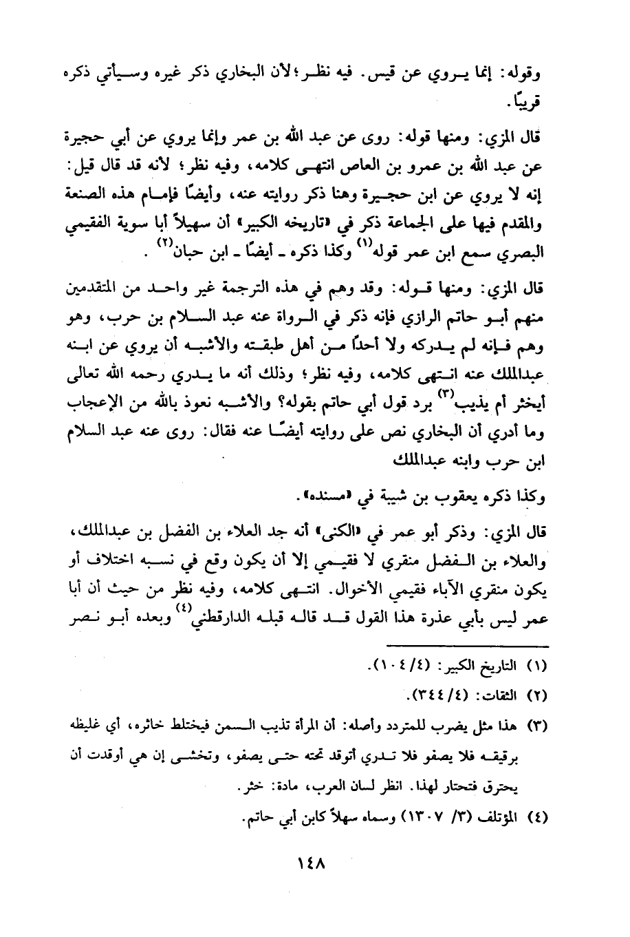 قال المزي: ومنها قوله: وقد وهم في هذه الترجمة غير واحد من المتقدمين منهم أبو حاتم الرازي؛ فإنه ذكر في الرواة عنه عبد السلام بن حرب، وهو وهم فإنه لم يدركه ولا أحدا من أهل طبقته، والأشبه أن يروي عن ابنه عبد الملك عنه انتهى كلامه، وفيه نظر؛ وذلك أنه ما يدري رحمه الله تعالى أيخثر أم يذيب برد قول أبي حاتم بقوله؟ والأشبه نعوذ بالله من الإعجاب وما أدري أن البخاري نص على روايته أيضا عنه فقال: روى عنه عبد السلام بن حرب وابنه عبد الملك.