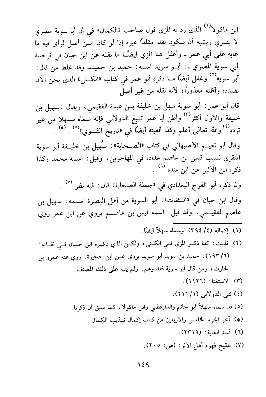 ابن ماكولا الذي رد به المزي قول صاحب "الكمال" في أن أبا سوية مصري لا بصري، ويشبه أن يكون نقله مقلدا غيره إذا لو كان من أصل لرأى فيه ما عابه على أبي عمر وأغفل هنا المزي أيضا ما نقله عن ابن حبان في ترجمة أبي سوية المصري: أبو سويد اسمه: حميد بن حميد وقد غلط من قال: أبو سويه وغفل أيضا ما ذكره أبو عمر في كتاب "الكنى" الذي نحن الآن بصدده وأظنه معذورا؛ لأنه نقل من غير أصل.