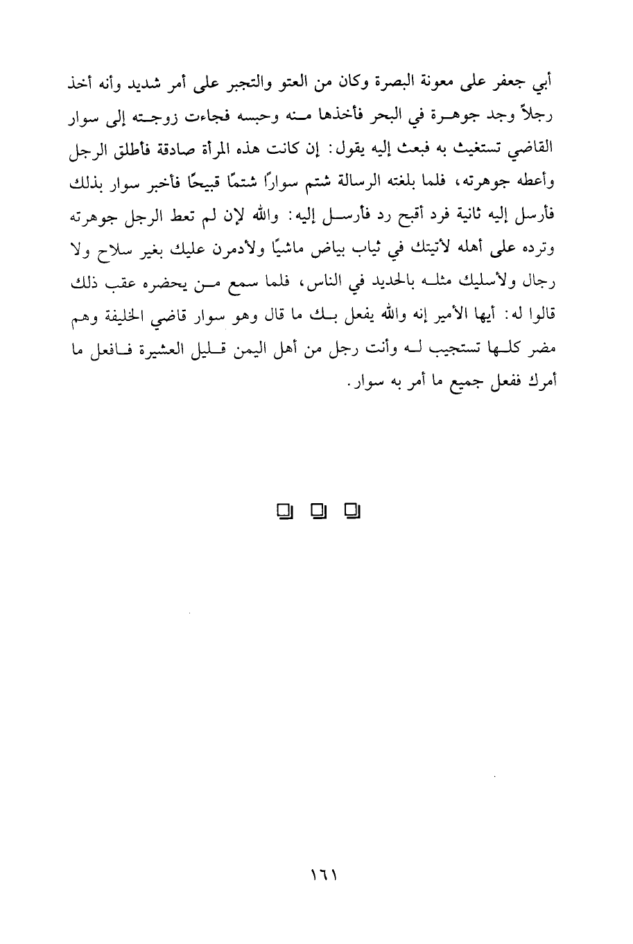 أبي جعفر على معونة البصرة وكان من العتو والتجبر على أمر شديد وأنه أخذ رجلا وجد جوهرة في البحر فأخذها منه وحبسه فجاءت زوجته إلى سوار القاضي تستغيث به فبعث إليه يقول: إن كانت هذه المرأة صادقة فأطلق الرجل وأعطه جوهرته، فلما بلغته الرسالة شتم سوارا شتما قبيحا فأخبر سوار بذلك فأرسل إليه ثانية فرد أقبح رد فأرسل إليه: والله لإن لم تعط الرجل جوهرته وترده على أهله لأتيتك في ثياب بياض ماشيا ولأدمرن عليك بغير سلاح ولا رجال ولأسليك مثله بالحديد في الناس، فلما سمع من يحضره عقب ذلك قالوا له: أيها الأمير إنه والله يفعل بك ما قال وهو سوار قاضي الخليفة وهم مضر كلها تستجيب له وأنت رجل من أهل اليمن قليل العشيرة فافعل ما أمرك ففعل جميع ما أمر به سوار.