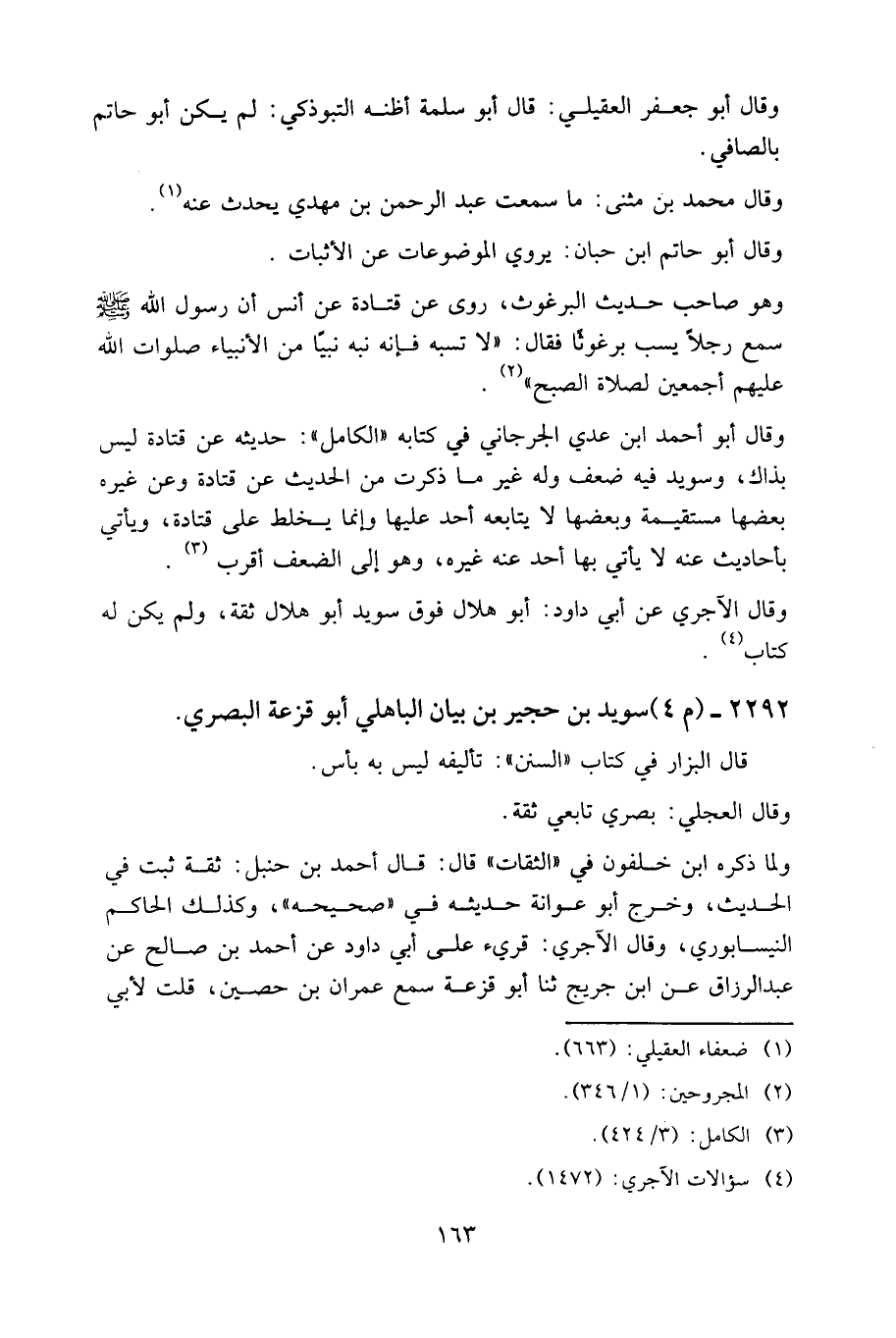 وقال أبو جعفر العقيلي: قال أبو سلمة أظنه التبوذكي: لم يكن أبو حاتم بالصافي.
