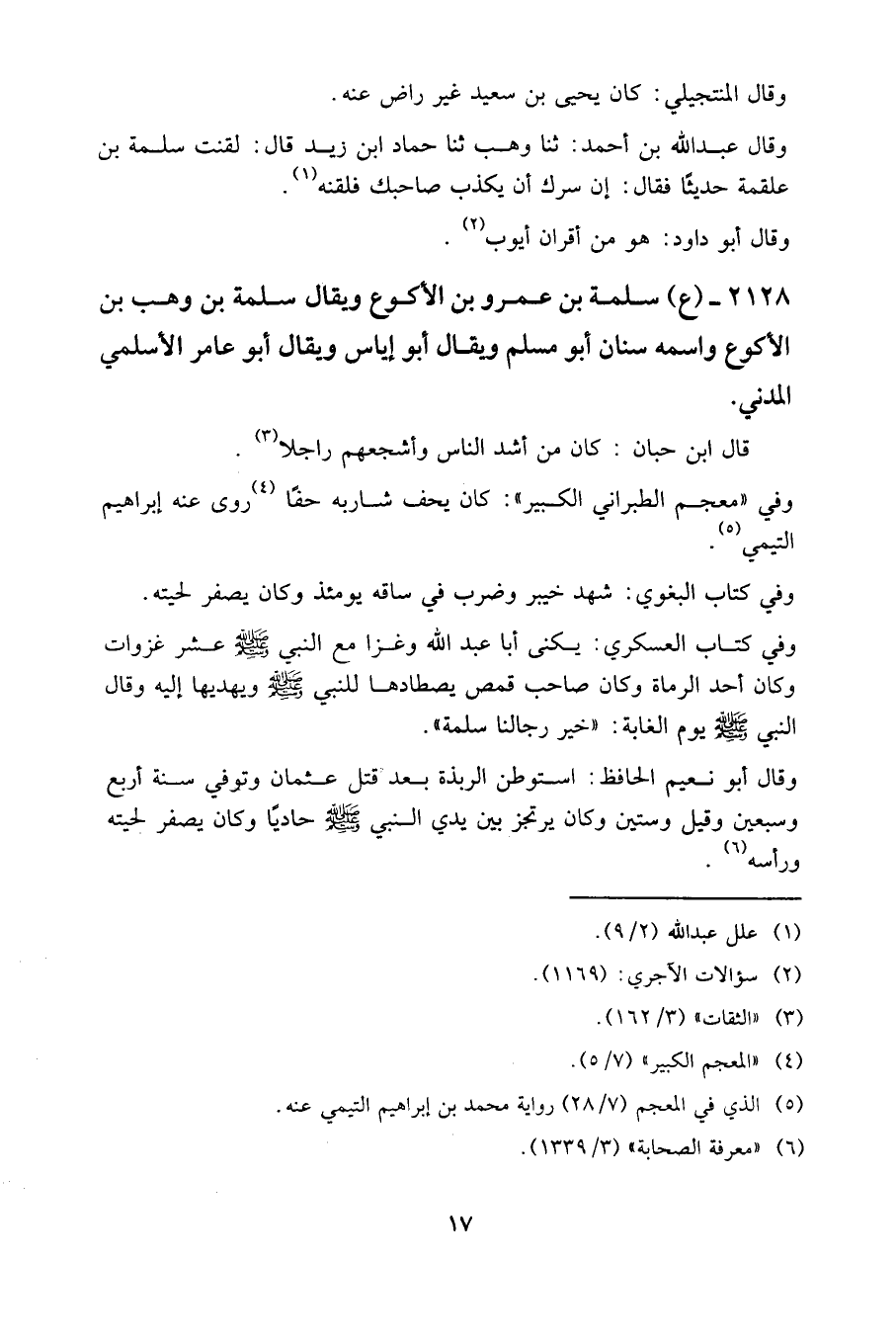 2128- (ع) سلمة بن عَمرو بن الأكوع ويقال سلمة بن وهب بن الأكوع واسمه سنان أبو مسلم ويقال أبو إياس ويقال أبو عامر الأسلمي المدني.