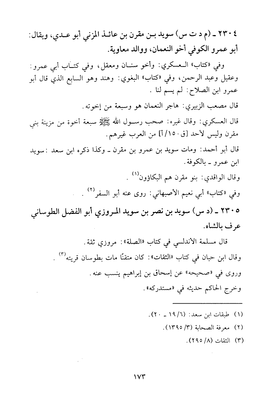 2304- (م د ت س) سويد بن مقرن بن عائذ المزني أبو عدي، ويقال: أبو عَمرو الكوفي أخو النعمان، ووالد معاوية.