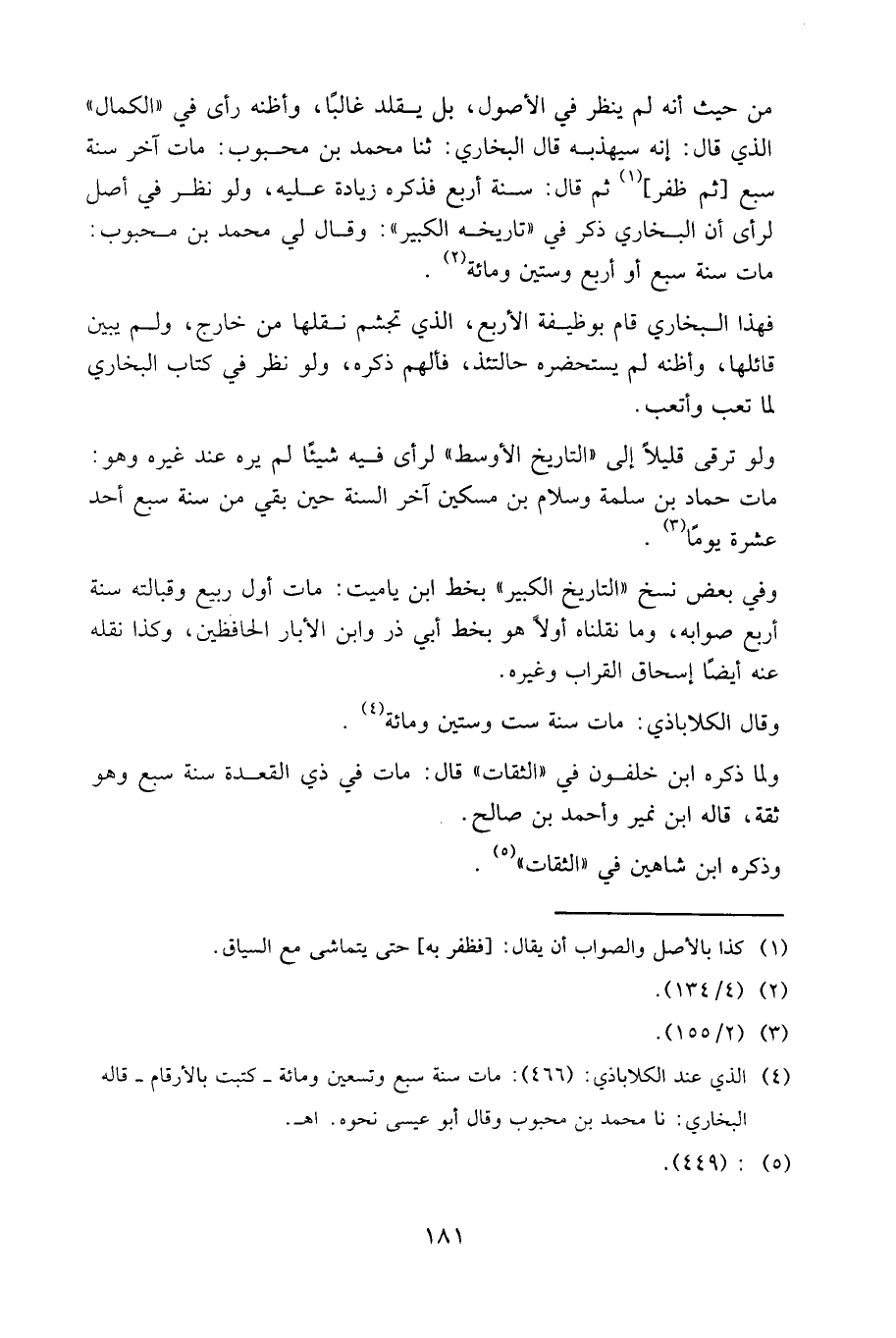 من حيث أنه لم ينظر في الأصول، بل يقلد غالبا، وأظنه رأى في "الكمال" الذي قال: إنه سيهذبه قال البخاري: حَدَّثنا محمد بن محبوب: مات آخر سنة سبع (ثم ظفر) ثم قال: سنة أربع فذكره زيادة عليه، ولو نظر في أصل لرأى أن البخاري ذكر في "تاريخه الكبير": وقال لي محمد بن محبوب: مات سنة سبع أو أربع وستين ومِائَة.
