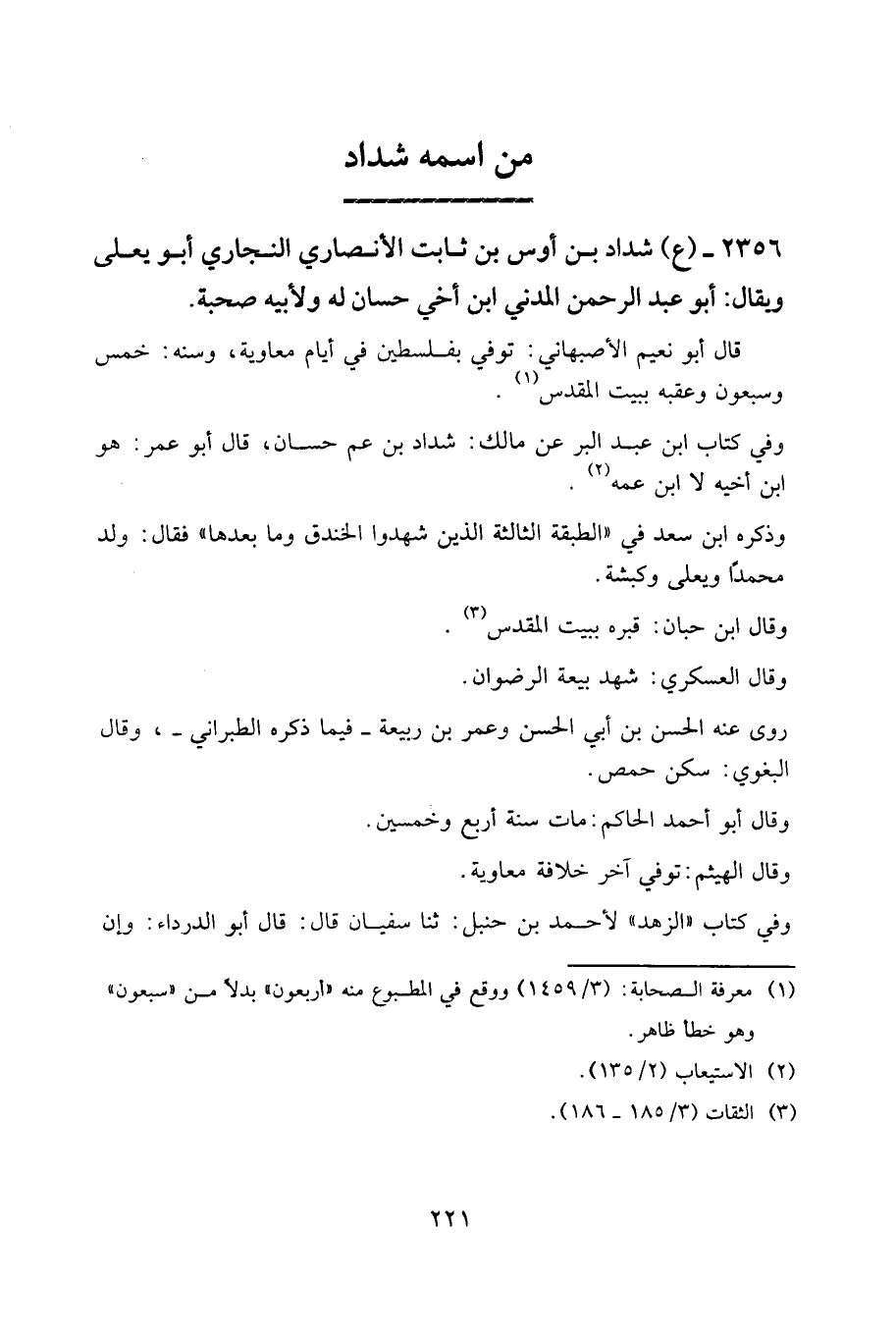 2356- (ع) شداد بن أوس بن ثابت الأنصاري النجاري أبو يعلى ويقال: أبو عبد الرحمن المدني ابن أخي حسان له ولأبيه صحبة.