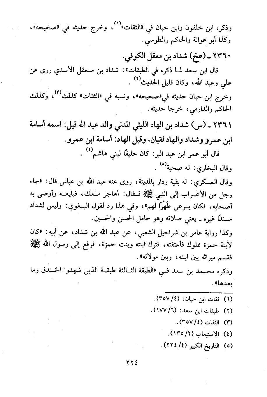 2361- (س) شداد بن الهاد الليثي المدني والد عبد الله قيل: اسمه أسامة بن عَمرو وشداد والهاد لقبان، وقيل الهاد: أسامة بن عمرو.