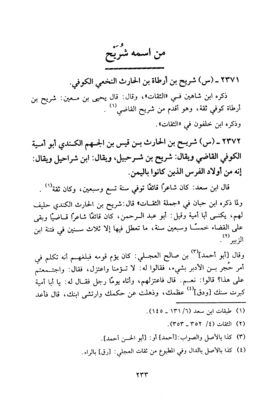 2372 - (س) شريح بن الحارث بن قيس بن الجهم الكندي أبو أمية الكوفي القاضي ويقال: شريح بن شرحبيل، ويقال: ابن شراحيل ويقال: إنه من أولاد الفرس الذين كانوا باليمن.