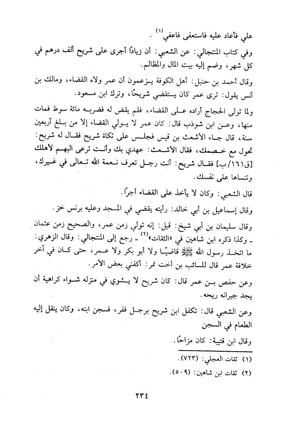 وفي كتاب المنتجالي: عن الشعبي: أن زيادا أجرى على شريح ألف درهم في كل شهر، وضم إليه بيت المال والمظالم.