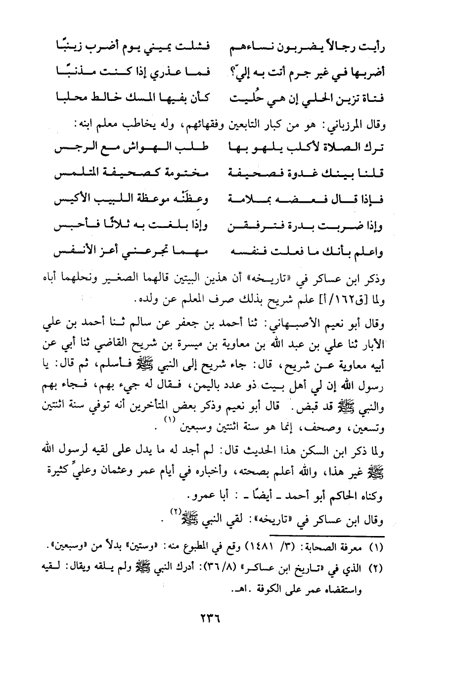 وذكر ابن عساكر في "تاريخه" أن هذين البيتين قالهما الصغير ونحلهما أباه ولما علم شريح بذلك صرف المعلم عن ولده.