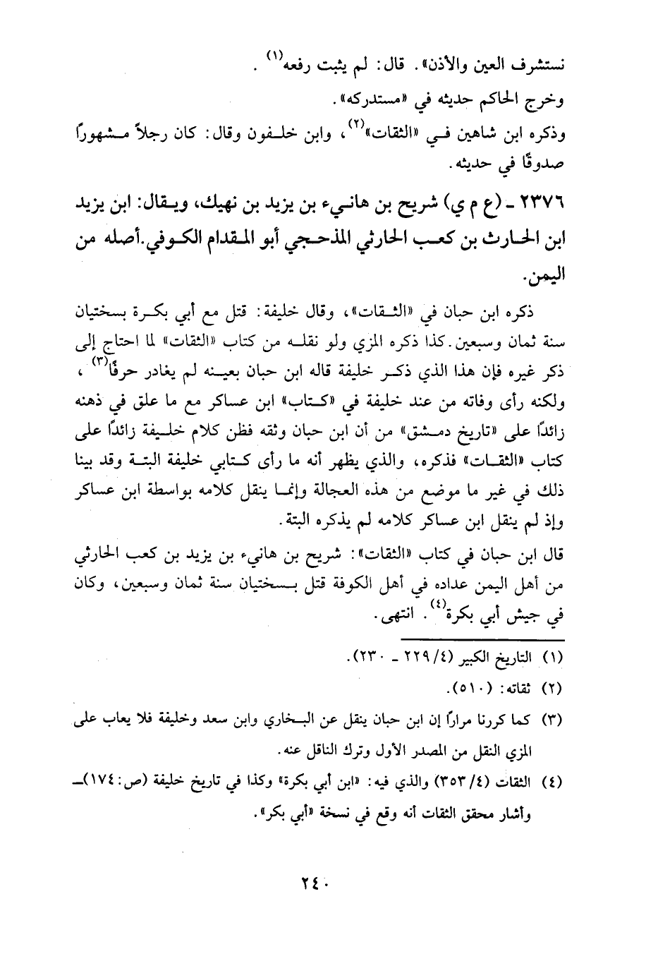 ذكره ابن حبان في "الثقات"، وقال خليفة: قتل مع أبي بكرة بسختيان سنة ثمان وسبعين. كذا ذكره المزي ولو نقله من كتاب "الثقات" لما احتاج إلى ذكر غيره، فإن هذا الذي ذكر خليفة قاله ابن حبان بعينه لم يغادر حرفا، ولكنه رأى وفاته من عند خليفة في "كتاب" ابن عساكر مع ما علق في ذهنه زائدا على "تاريخ دمشق" من أن ابن حبان وثقه فظن كلام خليفة زائدا على كتاب "الثقات" فذكره، والذي يظهر أنه ما رأى كتابي خليفة البتة وقد بينا ذلك في غير ما موضع من هذه العجالة، وإنما ينقل كلامه بواسطة ابن عساكر وإذ لم ينقل ابن عساكر كلامه لم يذكره البتة.