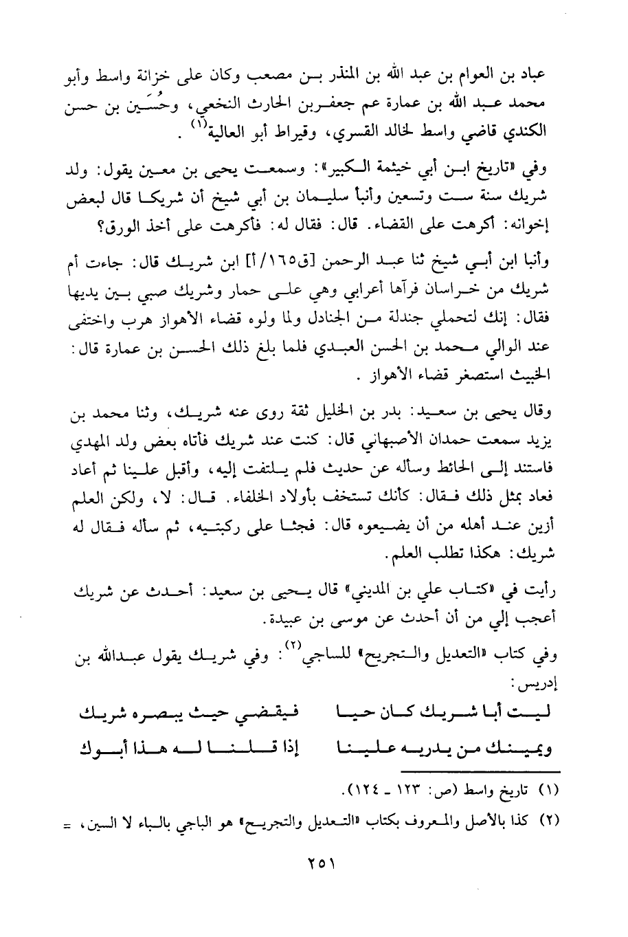 وفي كتاب "التعديل والتجريح" للساجي: وفي شريك يقول عبد الله بن إدريس: