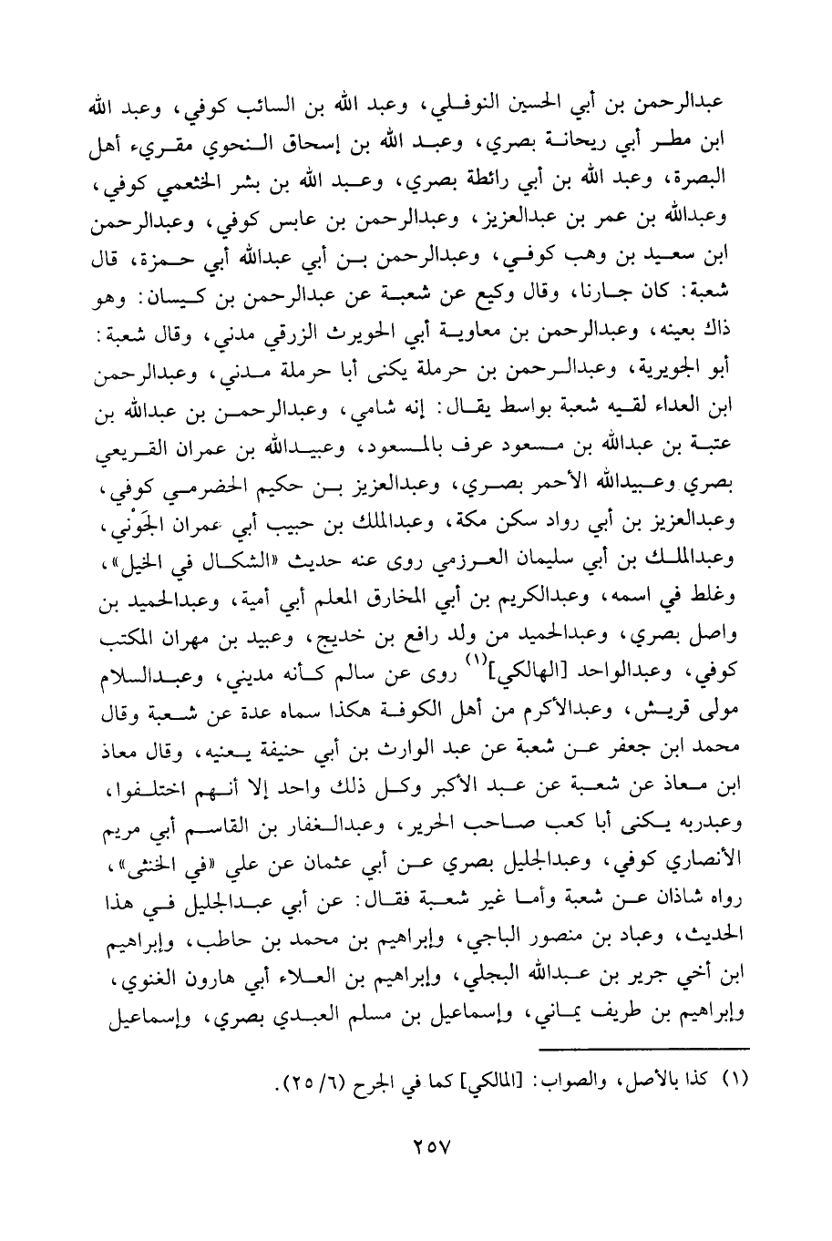 عبد الرحمن بن أبي الحسين النوفلي، وعبد الله بن السائب كوفي، وعبد الله بن مطر أبي ريحانة بصري، وعبد الله بن إسحاق النحوي مقرئ أهل البصرة، وعبد الله بن أبي رائطة بصري، وعبد الله بن بشر الخثعمي كوفي، وعبد الله بن عمر بن عبد العزيز، وعبد الرحمن بن عابس كوفي، وعبد الرحمن بن سعيد بن وهب كوفي، وعبد الرحمن بن أبي عبد الله أبي حمزة، قال شعبة: كان جارنا، وقال وكيع عن شعبة عن عبد الرحمن بن كيسان: وهو ذاك بعينه، وعبد الرحمن بن معاوية أبي الحويرث الزرقي مدني، وقال شعبة: أبو الجويرية، وعبد الرحمن بن حرملة يكنى أبا حرملة مدني، وعبد الرحمن بن العداء لقيه شعبة بواسط يقال: إنه شامي، وعبد الرحمن بن عبد الله بن عتبة بن عبد الله بن مسعود عرف بالمسعود، وعبيد الله بن عمران القريعي بصري وعبيد الله الأحمر بصري، وعبد العزيز بن حكيم الحضرمي كوفي، وعبد العزيز بن أبي رواد سكن مكة، وعبد الملك بن حبيب أبي عمران الجوني، وعبد الملك بن أبي سليمان العرزمي روى عنه حديث "الشكال في الخيل"، وغلط في اسمه، وعبد الكريم بن أبي المخارق المعلم أبي أمية، وعبد الحميد بن واصل بصري، وعبد الحميد من ولد رافع بن خديج، وعبيد بن مهران المكتب كوفي، وعبد الواحد الهالكي روى عن سالم كأنه مديني، وعبد السلام مولى قريش، وعبد الأكرم من أهل الكوفة هكذا سماه عدة عن شعبة، وقال محمد بن جعفر عن شعبة عن عبد الوارث بن أبي حنيفة يعنيه، وقال معاذ بن معاذ عن شعبة عن عبد الأكبر، وكل ذلك واحد إلا أنهم اختلفوا، وعبد ربه يكنى أبا كعب صاحب الحرير، وعبد الغفار بن القاسم أبي مريم الأنصاري كوفي، وعبد الجليل بصري عن أبي عثمان عن علي "في الخنثى"، رواه شاذان عن شعبة، وأما غير شعبة فقال: عن أبي عبد الجليل في هذا الحديث، وعباد بن منصور الباجي، وإبراهيم بن محمد بن حاطب، وإبراهيم ابن أخي جرير بن عبد الله البجلي، وإبراهيم بن العلاء أبي هارون الغنوي، وإبراهيم بن طريف يماني، وإسماعيل بن مسلم العبدي بصري، وإسماعيل