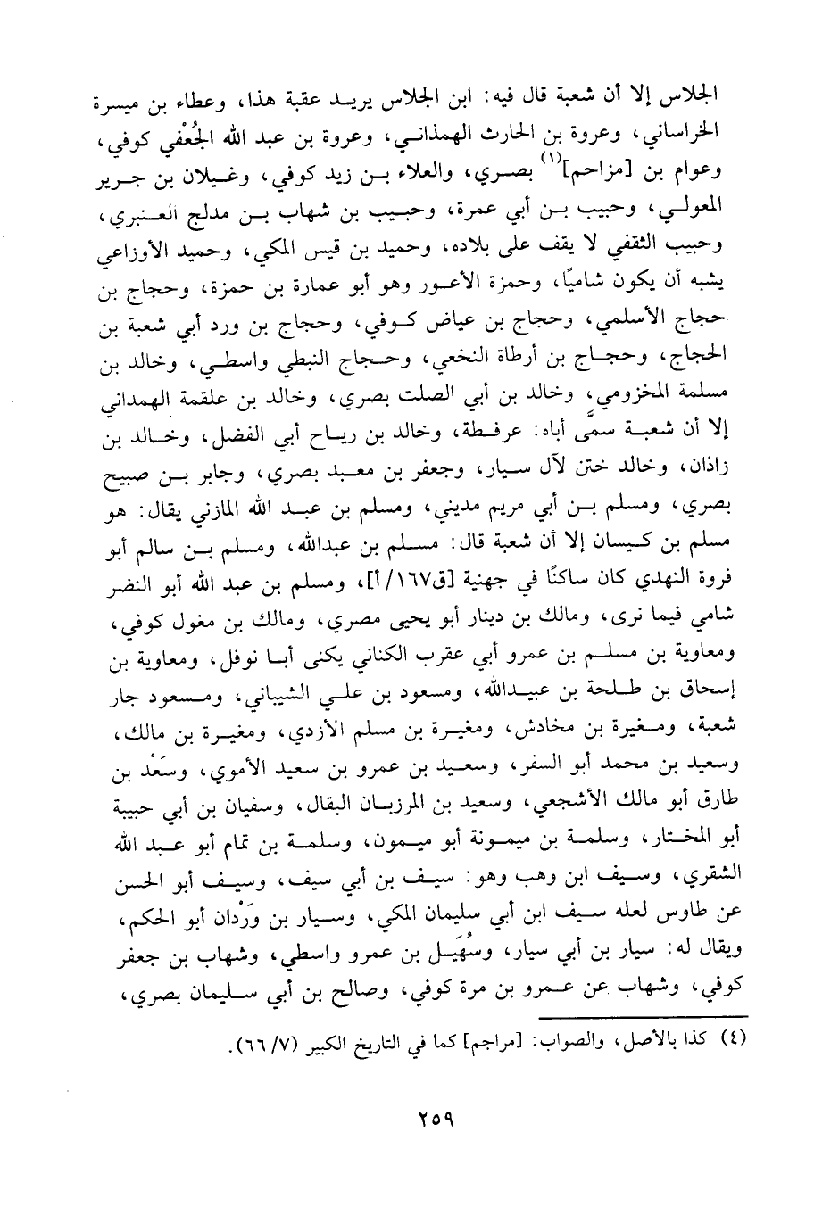الجلاس إلا أن شعبة قال فيه: ابن الجلاس يريد عقبة هذا، وعطاء بن ميسرة الخراساني، وعروة بن الحارث الهمذاني، وعروة بن عبد الله الجعفي كوفي، وعوام بن (مزاحم) بصري، والعلاء بن زيد كوفي، وغيلان بن جرير المعولي، وحبيب بن أبي عمرة، وحبيب بن شهاب بن مدلج العنبري، وحبيب الثقفي لا يقف على بلاده، وحميد بن قيس المكي، وحميد الأوزاعي يشبه أن يكون شاميا، وحمزة الأعور وهو أبو عمارة بن حمزة، وحجاج بن حجاج الأسلمي، وحجاج بن عياض كوفي، وحجاج بن ورد أبي شعبة بن الحجاج، وحجاج بن أرطاة النخعي، وحجاج النبطي واسطي، وخالد بن مسلمة المخزومي، وخالد بن أبي الصلت بصري، وخالد بن علقمة الهمداني إلا أن شعبة سمى أباه: عرفطة، وخالد بن رياح أبي الفضل، وخالد بن زاذان، وخالد ختن لآل سيار، وجعفر بن معبد بصري، وجابر بن صبيح بصري، ومسلم بن أبي مريم مديني، ومسلم بن عبد الله المازني يقال: هو مسلم بن كيسان إلا أن شعبة قال: مسلم بن عبد الله، ومسلم بن سالم أبو فروة النهدي كان ساكنا في جهينة، ومسلم بن عبد الله أبو النضر شامي فيما نرى، ومالك بن دينار أبو يحيى مصري، ومالك بن مغول كوفي، ومعاوية بن مسلم بن عَمرو أبي عقرب الكناني يكنى أبا نوفل، ومعاوية بن إسحاق بن طلحة بن عبيد الله، ومسعود بن علي الشيباني، ومسعود جار شعبة، ومغيرة بن مخادش، ومغيرة بن مسلم الأزدي، ومغيرة بن مالك، وسعيد بن محمد أبو السفر، وسعيد بن عَمرو بن سعيد الأموي، وسعد بن طارق أبو مالك الأشجعي، وسعيد بن المرزبان البقال، وسفيان بن أبي حبيبة أبو المختار، وسلمة بن ميمونة أبو ميمون، وسلمة بن تمام أبو عبد الله الشقري، وسيف بن وهب وهو: سيف ابن أبي سيف، وسيف أبو الحسن عن طاووس لعله سيف بن أبي سليمان المكي، وسيار بن وردان أبو الحكم، ويقال له: سيار بن أبي سيار، وسهيل بن عَمرو واسطي، وشهاب بن جعفر كوفي، وشهاب عن عَمرو بن مرة كوفي، وصالح بن أبي سليمان بصري،