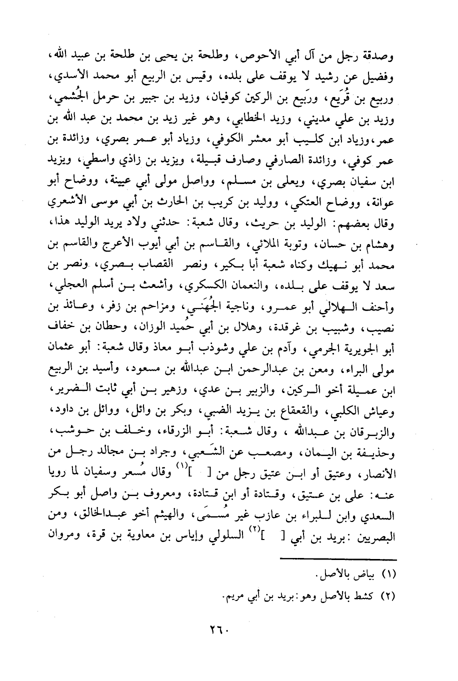 وصدقة رجل من آل أبي الأحوص، وطلحة بن يحيى بن طلحة بن عبيد الله، وفضيل عن رشيد لا يوقف على بلده، وقيس بن الربيع أبو محمد الأسدي، وربيع بن قريع، وربيع بن الركين كوفيان، وزيد بن جبير بن حرمل الجشمي، وزيد بن علي مديني، وزيد الخطابي، وهو غير زيد بن محمد بن عبد الله بن عمر، وزياد بن كليب أبو معشر الكوفي، وزياد أبو عمر بصري، وزائدة بن عمر كوفي، وزائدة الصارفي وصارف قبيلة، ويزيد بن زاذي واسطي، ويزيد بن سفيان بصري، ويعلى بن مسلم، وواصل مولى أبي عيينة، ووضاح أبو عوانة، ووضاح العتكي، ووليد بن كريب بن الحارث بن أبي موسى الأشعري، وقال بعضهم: الوليد بن حريث، وقال شعبة: حدثني ولاد يريد الوليد هذا، وهشام بن حسان، وتوبة الملائي، والقاسم بن أبي أيوب الأعرج، والقاسم بن محمد أبو نهيك، وكناه شعبة أبا بكير، ونصر القصاب بصري، ونصر بن سعد لا يوقف على بلده، والنعمان الكسكري، وأشعث بن أسلم العجلي، وأحنف الهلالي أبو عمرو، وناجية الجهني، ومزاحم بن زفر، وعائذ بن نصيب، وشبيب بن غرقدة، وهلال بن أبي حميد الوزان، وحطان بن خفاف أبو الجويرية الجرمي، وآدم بن علي، وشوذب أبو معاذ وقال شعبة: أبو عثمان مولى البراء، ومعن بن عبد الرحمن ابن عبد الله بن مسعود، وأسيد بن الربيع بن عميلة أخو الركين، والزبير بن عدي، وزهير بن أبي ثابت الضرير، وعياش الكلبي، والقعقاع بن يزيد الضبي، وبكر بن وائل، ووائل بن داود، والزبرقان بن عبد الله، وقال شعبة: أبو الزرقاء، وخلف بن حوشب، وحذيفة بن اليمان، ومصعب عن الشعبي، وجراد بن مجالد رجل من الأنصار، وعتيق أو ابن عتيق رجل من (...) وقال مسعر وسفيان لما رويا عنه: علي بن عتيق، وقتادة أو ابن قتادة، ومعروف بن واصل أبو بكر السعدي وابن للبراء بن عازب غير مسمى، والهيثم أخو عبد الخالق، ومن البصريين: بريد بن أبي (...) السلولي، وإياس بن معاوية بن قرة، ومروان