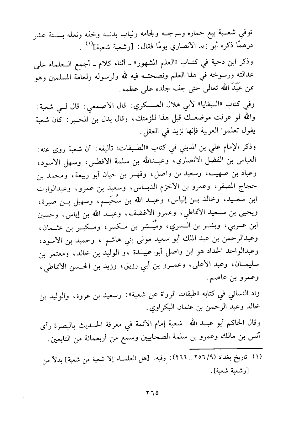 توفي شعبة بيع حماره وسرجه ولجامه وثياب بدنه وخفه ونعله بستة عشر درهما ذكره أبو زيد الأنصاري يوما فقال: (وشعبة شعبة).