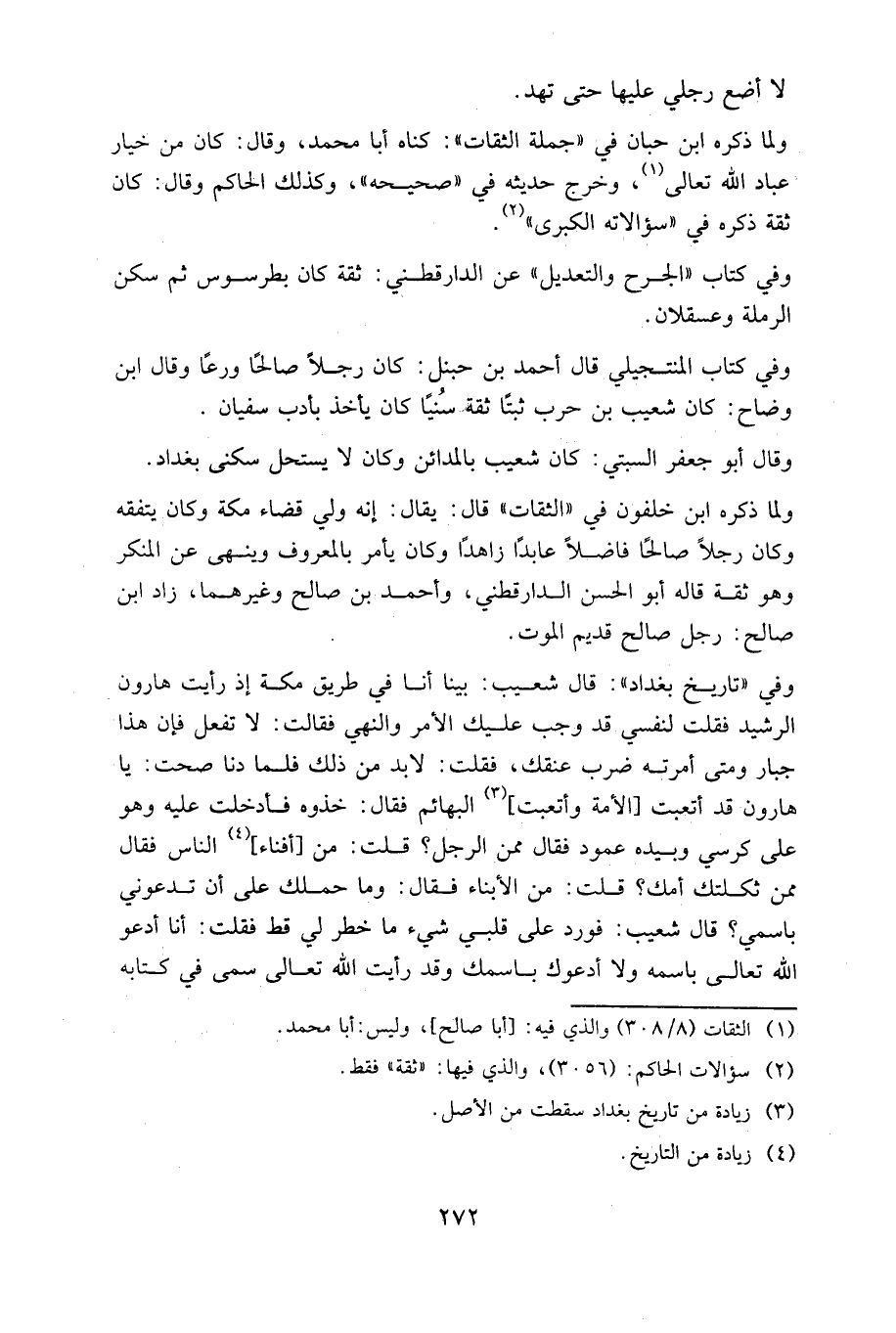 وفي "تاريخ بغداد": قال شعيب: بينا أنا في طريق مكة إذ رأيت هارون الرشيد فقلت لنفسي قد وجب عليك الأمر والنهي فقالت: لا تفعل فإن هذا جبار، ومتى أمرته ضرب عنقك، فقلت: لا بد من ذلك، فلما دنا صحت: يا هارون قد أتعبت (الأمة وأتعبت) البهائم فقال: خذوه فأدخلت عليه وهو على كرسي وبيده عمود، فقال ممن الرجل؟ قلت: من (أفناء) الناس، فقال ممن ثكلتك أمك؟ قلت: من الأبناء فقال: وما حملك على أن تدعوني باسمي؟ قال شعيب: فورد على قلبي شيء ما خطر لي قط فقلت: أنا أدعو الله تعالى باسمه ولا أدعوك باسمك، وقد رأيت الله تعالى سمى في كتابه