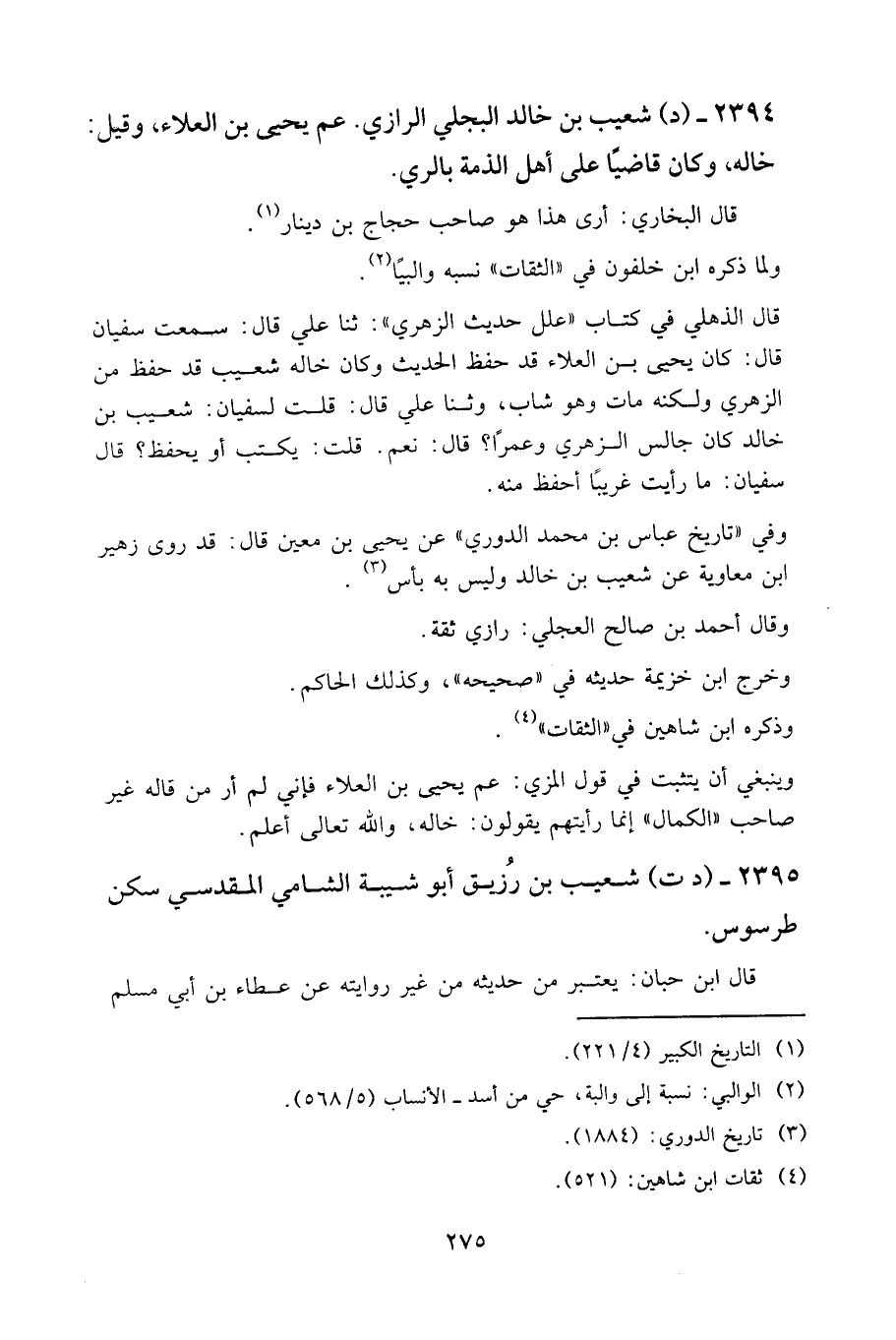 2394- (د) شعيب بن خالد البجلي الرازي. عم يحيى بن العلاء، وقيل: خاله، وكان قاضيا على أهل الذمة بالري.