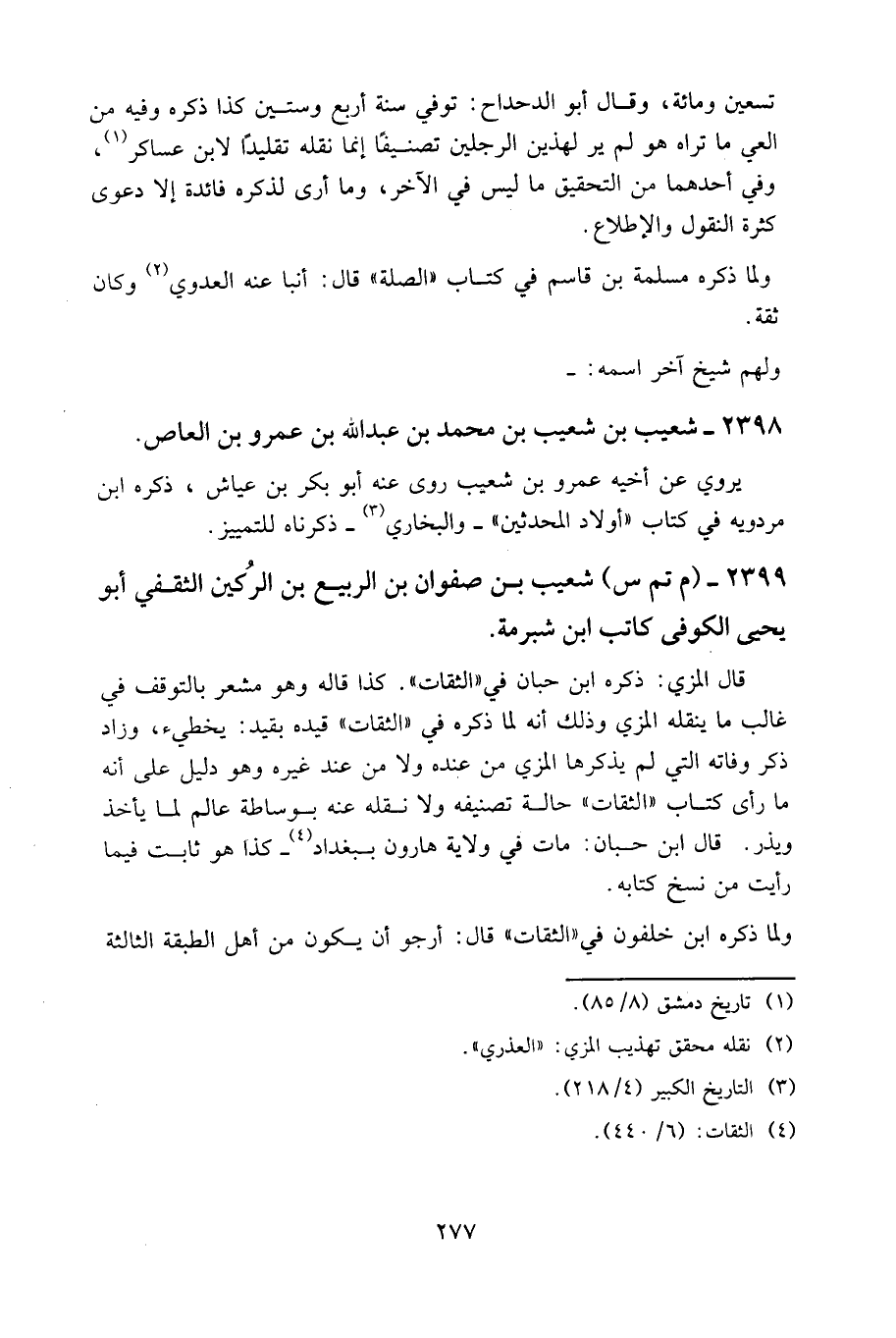2399- (م تم س) شعيب بن صفوان بن الربيع بن الركين الثقفي أبو يحيى الكوفي كاتب ابن شبرمة.