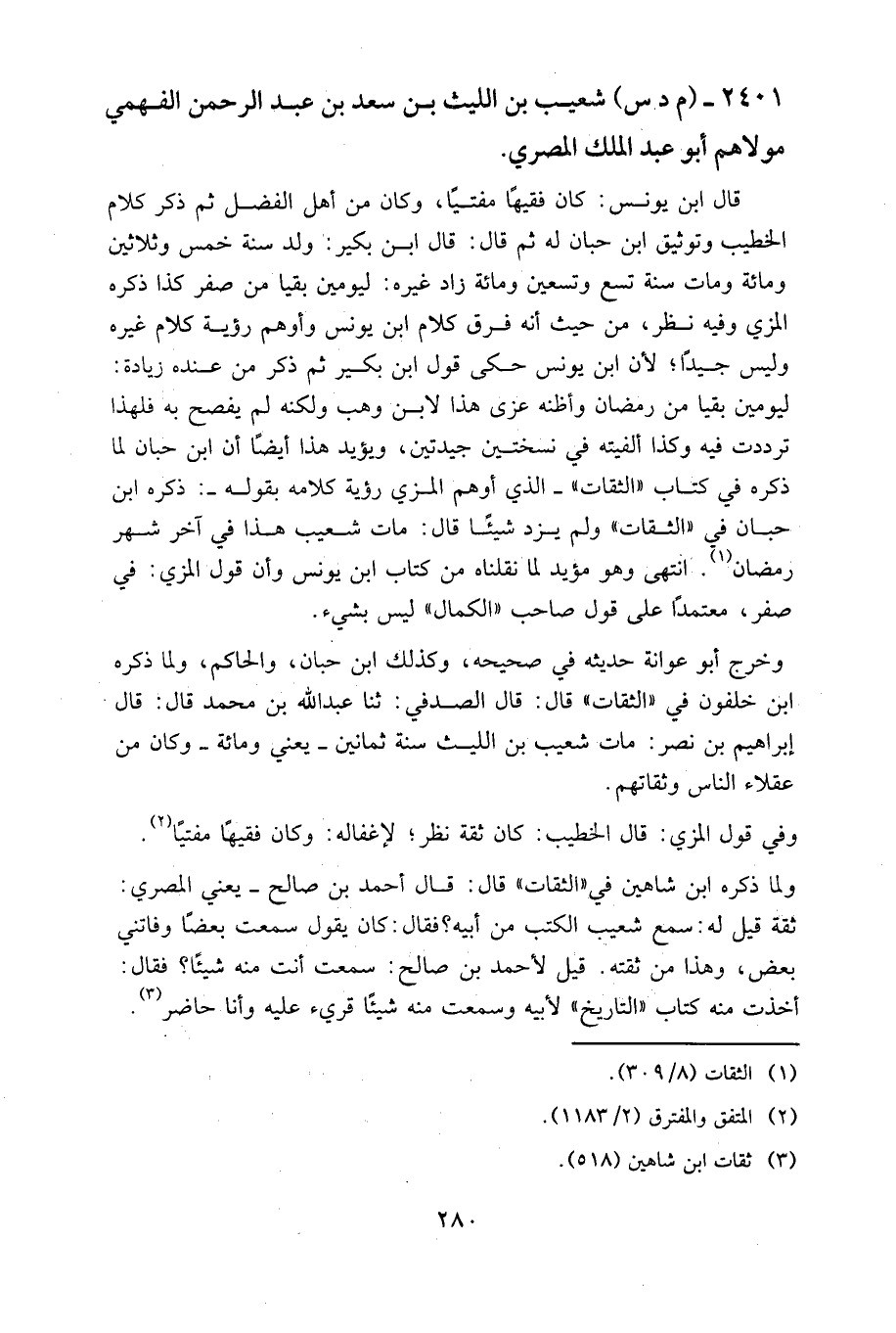 قال ابن يونس: كان فقيها مفتيا، وكان من أهل الفضل، ثم ذكر كلام الخطيب وتوثيق ابن حبان له ثم قال: قال ابن بكير: ولد سنة خمس وثلاثين ومِائَة، ومات سنة تسع وتسعين ومِائَة زاد غيره: ليومين بقيا من صفر كذا ذكره المزي وفيه نظر، من حيث أنه فرق كلام ابن يونس وأوهم رؤية كلام غيره وليس جيدا؛ لأن ابن يونس حكى قول ابن بكير ثم ذكر من عنده زيادة: ليومين بقيا من رمضان، وأظنه عزى هذا لابن وهب، ولكنه لم يفصح به فلهذا ترددت فيه، وكذا ألفيته في نسختين جيدتين، ويؤيد هذا أيضا أن ابن حبان لما ذكره في كتاب "الثقات" الذي أوهم المزي رؤية كلامه بقوله: ذكره ابن حبان في "الثقات" ولم يزد شيئا قال: مات شعيب هذا في آخر شهر رمضان. انتهى وهو مؤيد لما نقلناه من كتاب ابن يونس وأن قول المزي: في صفر، معتمدا على قول صاحب "الكمال" ليس بشيء.